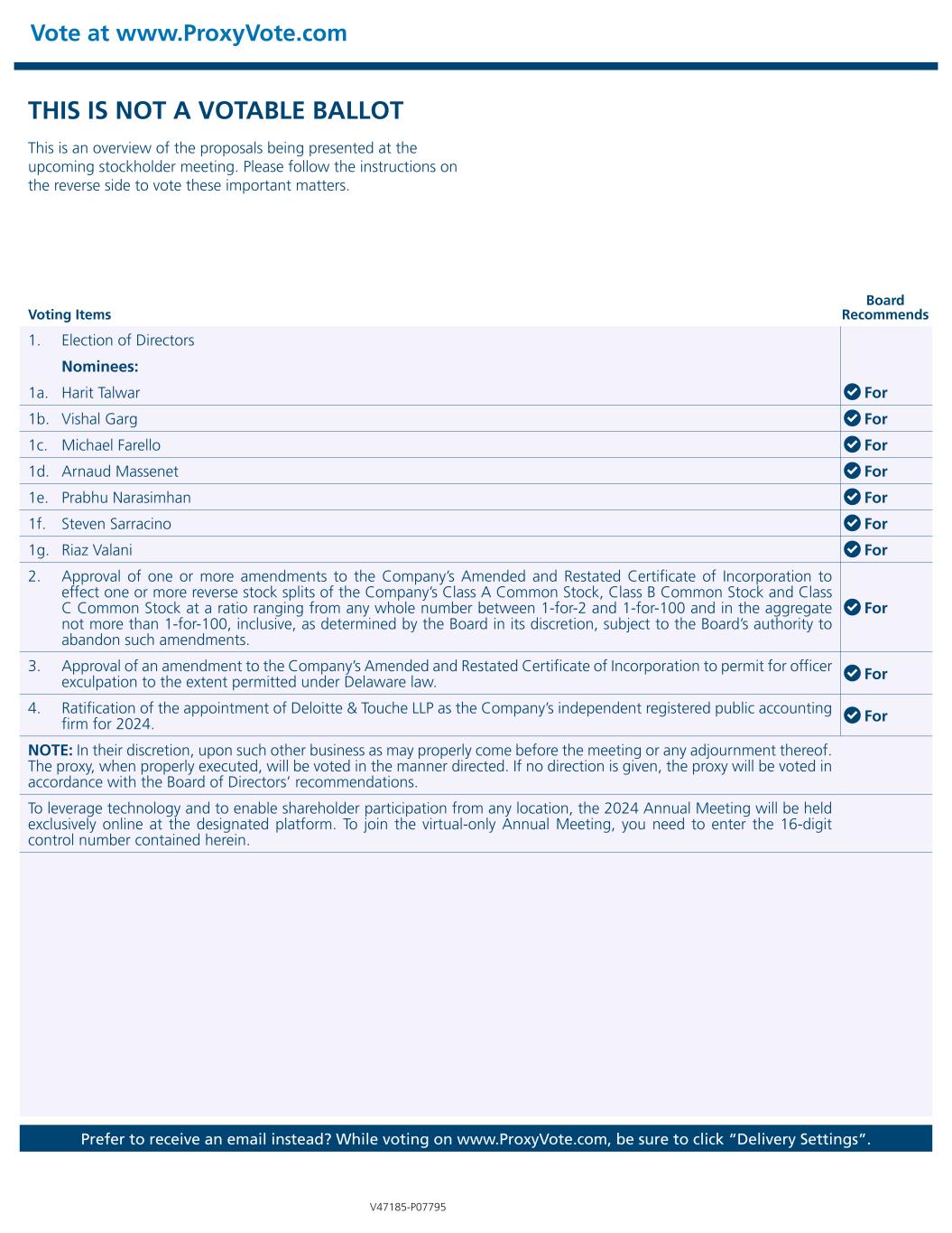 THIS IS NOT A VOTABLE BALLOT This is an overview of the proposals being presented at the upcoming stockholder meeting. Please follow the instructions on the reverse side to vote these important matters. Vote at www.ProxyVote.com Prefer to receive an email instead? While voting on www.ProxyVote.com, be sure to click “Delivery Settings”. Voting Items Board Recommends V47185-P07795 1. Election of Directors Nominees: 1a. Harit Talwar For 1b. Vishal Garg For 1c. Michael Farello For 1d. Arnaud Massenet For 1e. Prabhu Narasimhan For 1f. Steven Sarracino For 1g. Riaz Valani For 2. Approval of one or more amendments to the Company’s Amended and Restated Certificate of Incorporation to effect one or more reverse stock splits of the Company’s Class A Common Stock, Class B Common Stock and Class C Common Stock at a ratio ranging from any whole number between 1-for-2 and 1-for-100 and in the aggregate not more than 1-for-100, inclusive, as determined by the Board in its discretion, subject to the Board’s authority to abandon such amendments. For 3. Approval of an amendment to the Company’s Amended and Restated Certificate of Incorporation to permit for officer exculpation to the extent permitted under Delaware law. For 4. Ratification of the appointment of Deloitte & Touche LLP as the Company’s independent registered public accounting firm for 2024. For NOTE: In their discretion, upon such other business as may properly come before the meeting or any adjournment thereof. The proxy, when properly executed, will be voted in the manner directed. If no direction is given, the proxy will be voted in accordance with the Board of Directors’ recommendations. To leverage technology and to enable shareholder participation from any location, the 2024 Annual Meeting will be held exclusively online at the designated platform. To join the virtual-only Annual Meeting, you need to enter the 16-digit control number contained herein.