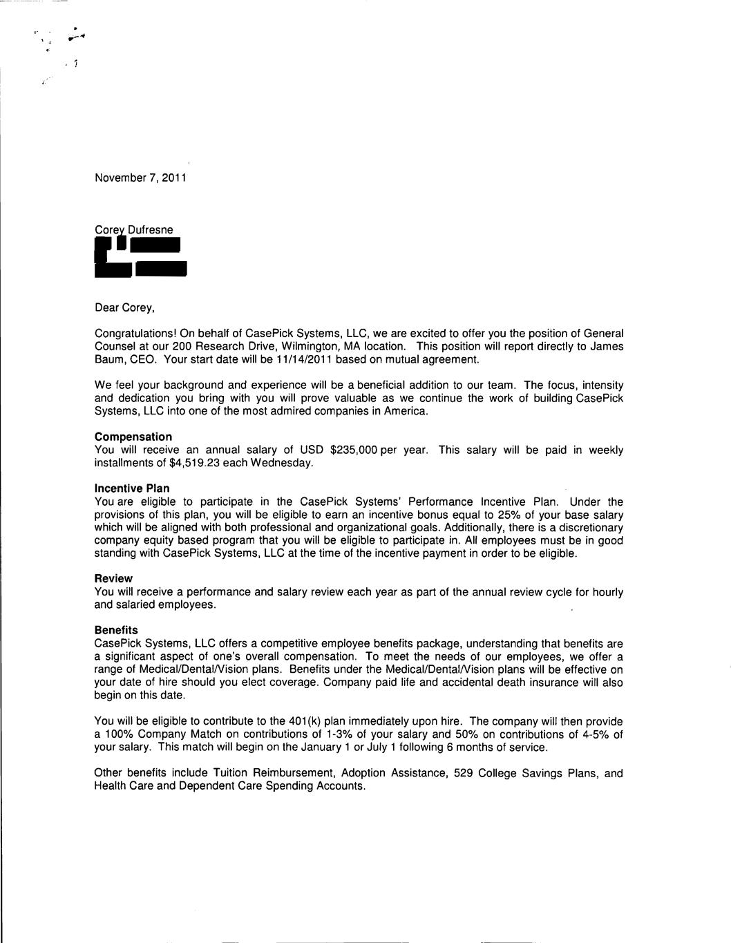November 7, 2011 Corey Dufresne Dear Corey, Congratulations! On behalf of CasePick Systems, LLC, we are excited to offer you the position of General Counsel at our 200 Research Drive, Wilmington, MA location. This position will report directly to James Baum, CEO. Your start date will be 11/14/2011 based on mutual agreement. We feel your background and experience will be a beneficial addition to our team. The focus, intensity and dedication you bring with you will prove valuable as we continue the work of building CasePick Systems, LLC into one of the most admired companies in America. Compensation You will receive an annual salary of USD $235,000 per year. This salary will be paid in weekly installments of $4,519.23 each Wednesday. Incentive Plan You are eligible to participate in the CasePick Systems' Performance Incentive Plan. Under the provisions of this plan, you will be eligible to earn an incentive bonus equal to 25% of your base salary which will be aligned with both professional and organizational goals. Additionally, there is a discretionary company equity based program that you will be eligible to participate in. All employees must be in good standing with CasePick Systems, LLC at the time of the incentive payment in order to be eligible. Review You will receive a performance and salary review each year as part of the annual review cycle for hourly and salaried employees. Benefits CasePick Systems, LLC offers a competitive employee benefits package, understanding that benefits are a significant aspect of one's overall compensation. To meet the needs of our employees, we offer a range of Medical/Dental/Vision plans. Benefits under the Medical/Dental/Vision plans will be effective on your date of hire should you elect coverage. Company paid life and accidental death insurance will also begin on this date. You will be eligible to contribute to the 401(k) plan immediately upon hire. The company will then provide a 100% Company Match on contributions of 1-3% of your salary and 50% on contributions of 4-5% of your salary. This match will begin on the January 1 or July 1 following 6 months of service. Other benefits include Tuition Reimbursement, Adoption Assistance, 529 College Savings Plans, and Health Care and Dependent Care Spending Accounts.