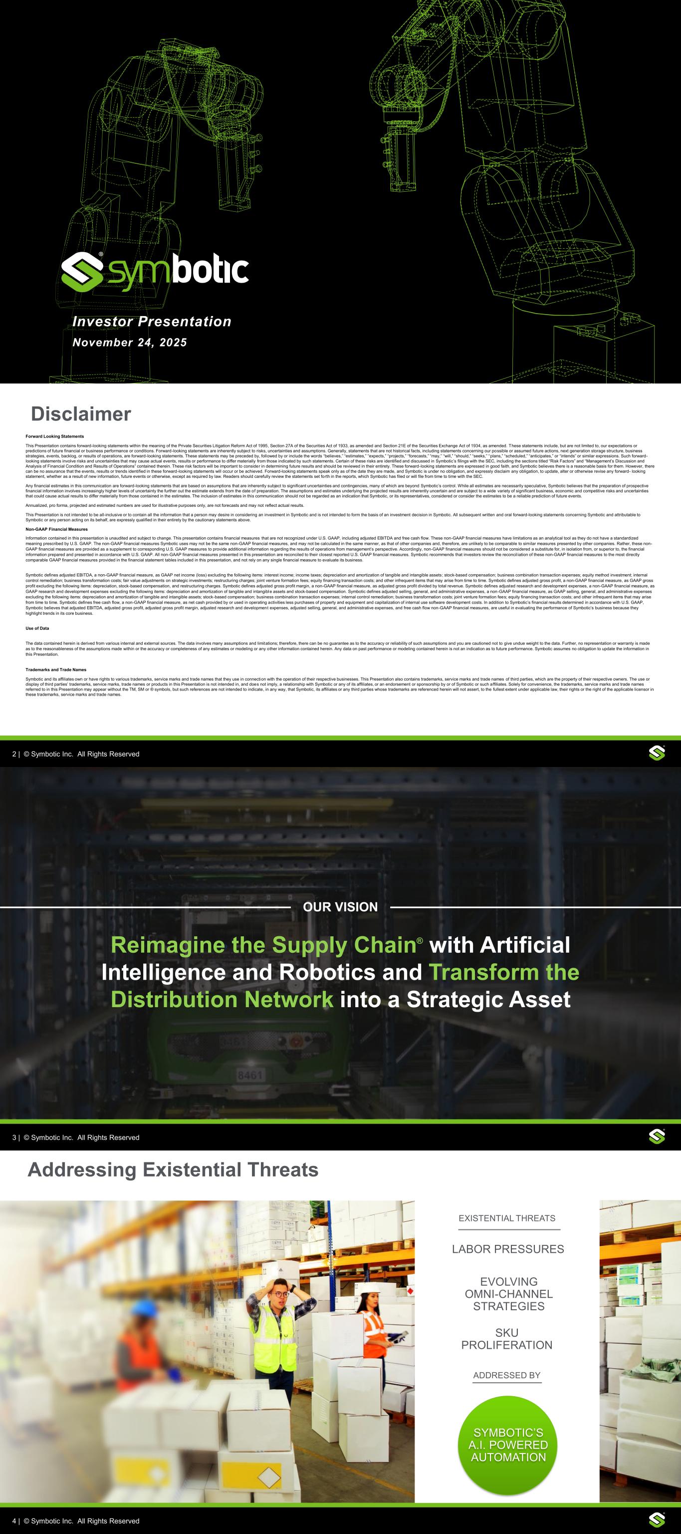 1 | © Symbotic, Inc. All Rights Reserved | Proprietary and ConfidentialInc. Al Rights Reserved Investor Presentation November 24, 2025 2 | © Symbotic, Inc. All Rights Reserved | Proprietary and ConfidentialInc. Al Rights Reserved Disclaimer Forward Looking Statements This Presentation contains forward-looking statements within the meaning of the Private Securities Litigation Reform Act of 1995, Section 27A of the Securities Act of 1933, as amended and Section 21E of the Securities Exchange Act of 1934, as amended. These statements include, but are not limited to, our expectations or predictions of future financial or business performance or conditions. Forward-looking statements are inherently subject to risks, uncertainties and assumptions. Generally, statements that are not historical facts, including statements concerning our possible or assumed future actions, next generation storage structure, business strategies, events, backlog, or results of operations, are forward-looking statements. These statements may be preceded by, followed by or include the words “believes,” “estimates,” “expects,” “projects,” “forecasts,” “may,” “will,” “should,” “seeks,” “plans,” “scheduled,” “anticipates,” or “intends” or similar expressions. Such forward- looking statements involve risks and uncertainties that may cause actual events, results or performance to differ materially from those indicated by such statements. Certain of these risks are identified and discussed in Symbotic’s filings with the SEC, including the sections titled “Risk Factors” and “Management’s Discussion and Analysis of Financial Condition and Results of Operations” contained therein. These risk factors will be important to consider in determining future results and should be reviewed in their entirety. These forward-looking statements are expressed in good faith, and Symbotic believes there is a reasonable basis for them. However, there can be no assurance that the events, results or trends identified in these forward-looking statements will occur or be achieved. Forward-looking statements speak only as of the date they are made, and Symbotic is under no obligation, and expressly disclaim any obligation, to update, alter or otherwise revise any forward- looking statement, whether as a result of new information, future events or otherwise, except as required by law. Readers should carefully review the statements set forth in the reports, which Symbotic has filed or will file from time to time with the SEC. Any financial estimates in this communication are forward-looking statements that are based on assumptions that are inherently subject to significant uncertainties and contingencies, many of which are beyond Symbotic’s control. While all estimates are necessarily speculative, Symbotic believes that the preparation of prospective financial information involves increasingly higher levels of uncertainty the further out the estimate extends from the date of preparation. The assumptions and estimates underlying the projected results are inherently uncertain and are subject to a wide variety of significant business, economic and competitive risks and uncertainties that could cause actual results to differ materially from those contained in the estimates. The inclusion of estimates in this communication should not be regarded as an indication that Symbotic, or its representatives, considered or consider the estimates to be a reliable prediction of future events. Annualized, pro forma, projected and estimated numbers are used for illustrative purposes only, are not forecasts and may not reflect actual results. This Presentation is not intended to be all-inclusive or to contain all the information that a person may desire in considering an investment in Symbotic and is not intended to form the basis of an investment decision in Symbotic. All subsequent written and oral forward-looking statements concerning Symbotic and attributable to Symbotic or any person acting on its behalf, are expressly qualified in their entirety by the cautionary statements above. Non-GAAP Financial Measures Information contained in this presentation is unaudited and subject to change. This presentation contains financial measures that are not recognized under U.S. GAAP, including adjusted EBITDA and free cash flow. These non-GAAP financial measures have limitations as an analytical tool as they do not have a standardized meaning prescribed by U.S. GAAP. The non-GAAP financial measures Symbotic uses may not be the same non-GAAP financial measures, and may not be calculated in the same manner, as that of other companies and, therefore, are unlikely to be comparable to similar measures presented by other companies. Rather, these non- GAAP financial measures are provided as a supplement to corresponding U.S. GAAP measures to provide additional information regarding the results of operations from management’s perspective. Accordingly, non-GAAP financial measures should not be considered a substitute for, in isolation from, or superior to, the financial information prepared and presented in accordance with U.S. GAAP. All non-GAAP financial measures presented in this presentation are reconciled to their closest reported U.S. GAAP financial measures. Symbotic recommends that investors review the reconcil iation of these non-GAAP financial measures to the most directly comparable GAAP financial measures provided in the financial statement tables included in this presentation, and not rely on any single financial measure to evaluate its business. Symbotic defines adjusted EBITDA, a non-GAAP financial measure, as GAAP net income (loss) excluding the following items: interest income; income taxes; depreciation and amortization of tangible and intangible assets; stock-based compensation; business combination transaction expenses; equity method investment; internal control remediation; business transformat