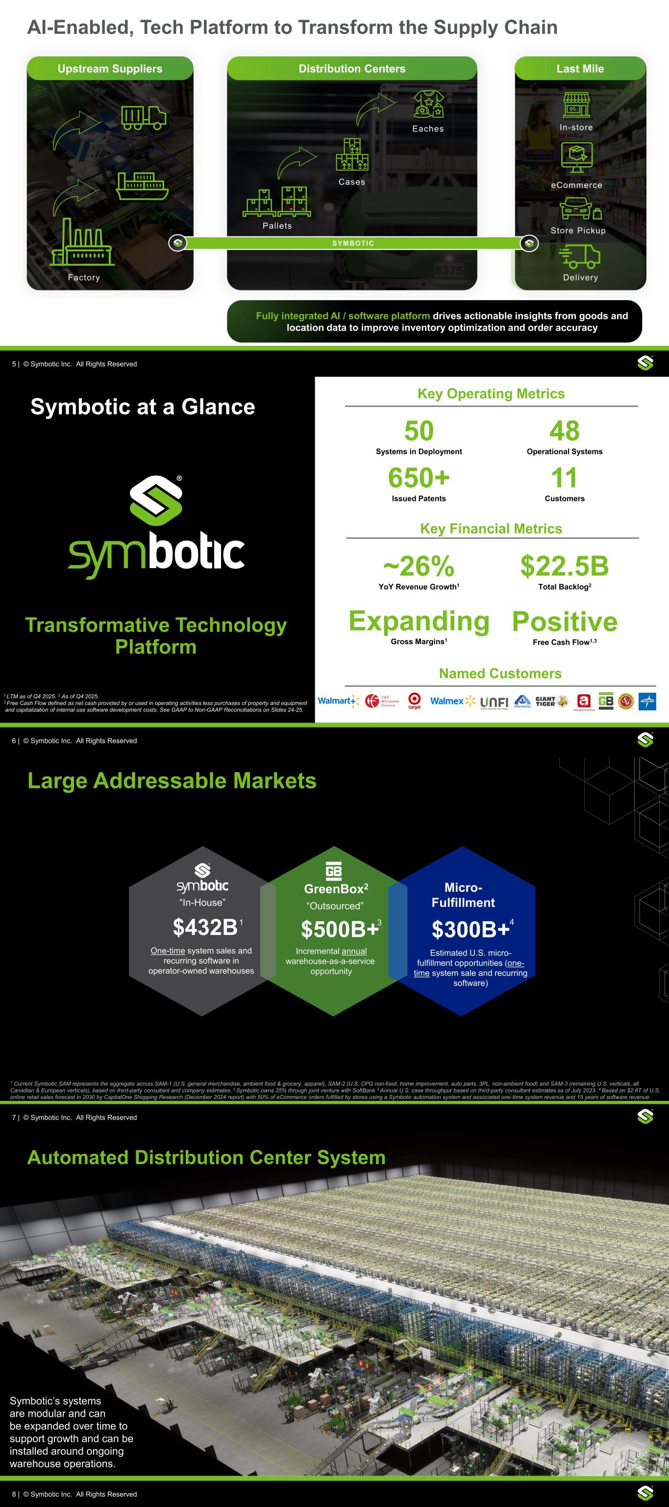 5 | © Symbotic, Inc. All Rights Reserved | Proprietary and Confidential Inc. Al Rights Reserved AI-Enabled, Tech Platform to Transform the Supply Chain Upstream Suppliers Distribution Centers Fully integrated AI / software platform drives actionable insights from goods and location data to improve inventory optimization and order accuracy Pallets Cases Eaches Last Mile In-store Store Pickup eCommerce SYMBOTIC Factory Delivery 6 | © Symbotic, Inc. All Rights Reserved | Proprietary and Confidential Inc. Al Rights Reserved Transformative Technology Platform Key Financial Metrics ~26% YoY Revenue Growth1 Expanding Gross Margins1 $22.5B Total Backlog2 Key Operating Metrics 50 Systems in Deployment 48 Operational Systems 11 Customers 650+ Issued Patents Named Customers Symbotic at a Glance 1 LTM as of Q4 2025. 2 As of Q4 2025. 3 Free Cash Flow defined as net cash provided by or used in operating activities less purchases of property and equipment and capitalization of internal use software development costs. See GAAP to Non-GAAP Reconciliations on Slides 24-25. Positive Free Cash Flow1,3 7 | © Symbotic, Inc. All Rights Reserved | Proprietary and Confidential Inc. Al Rights Reserved Large Addressable Markets 1 Current Symbotic SAM represents the aggregate across SAM-1 (U.S. general merchandise, ambient food & grocery, apparel), SAM-2 (U.S. CPG non-food, home improvement, auto parts, 3PL, non-ambient food) and SAM-3 (remaining U.S. verticals, all Canadian & European verticals), based on third-party consultant and company estimates. 2 Symbotic owns 35% through joint venture with SoftBank 3 Annual U.S. case throughput based on third-party consultant estimates as of July 2023. 4 Based on $2.6T of U.S. online retail sales forecast in 2030 by CapitalOne Shopping Research (December 2024 report) with 50% of eCommerce orders fulfilled by stores using a Symbotic automation system and associated one-time system revenue and 15 years of software revenue. GreenBox2 $500B+ “Outsourced” Incremental annual warehouse-as-a-service opportunity 3$432B One-time system sales and recurring software in operator-owned warehouses “In-House” 1 Micro- Fulfillment $300B+ Estimated U.S. micro- fulfillment opportunities (one- time system sale and recurring software) 4 8 | © Symbotic, Inc. All Rights Reserved | Proprietary and Confidential Inc. Al Rights Reserved Automated Distribution Center System Symbotic’s systems are modular and can be expanded over time to support growth and can be installed around ongoing warehouse operations.