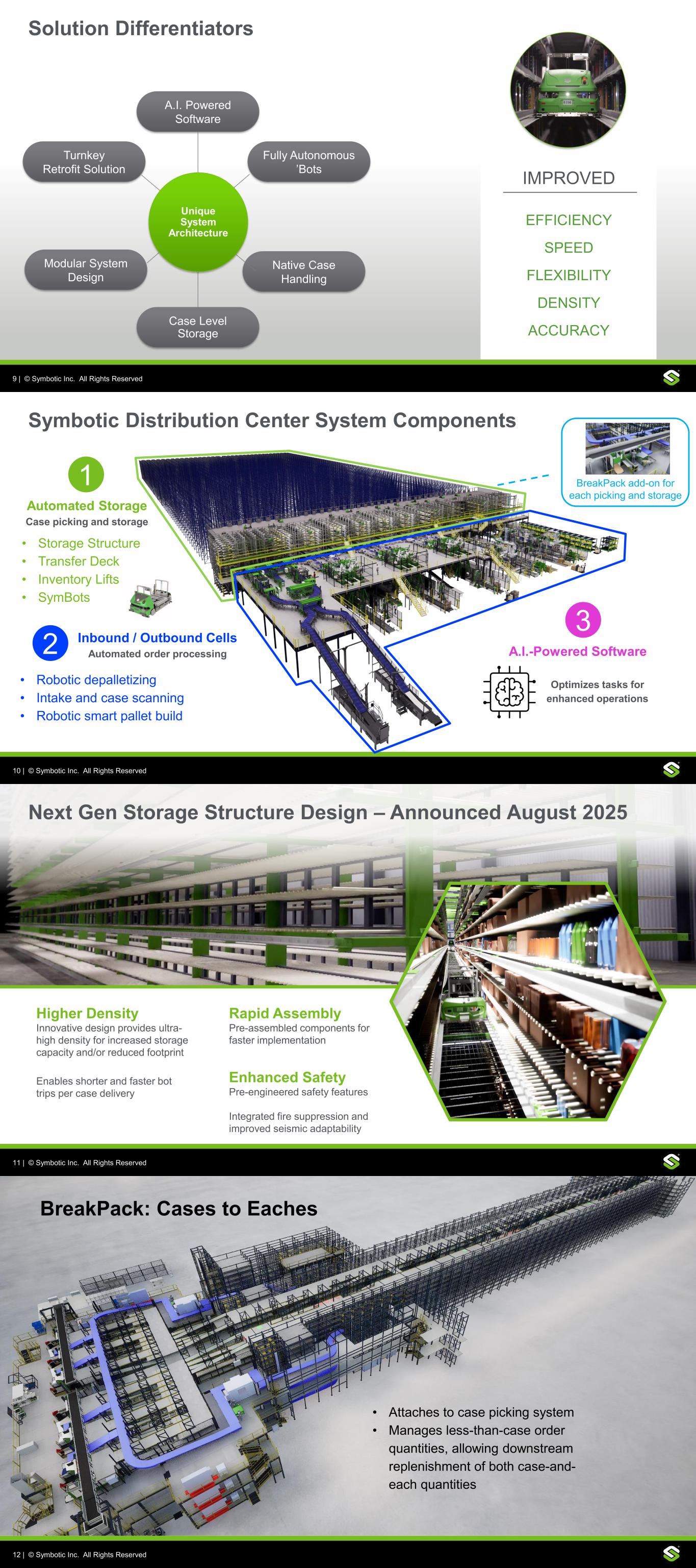 9 | © Symbotic, Inc. All Rights Reserved | Proprietary and Confidential Inc. Al Rights Reserved Solution Differentiators A.I. Powered Software Fully Autonomous ’Bots Native Case Handling Case Level Storage Modular System Design Turnkey Retrofit Solution Unique System Architecture IMPROVED EFFICIENCY SPEED FLEXIBILITY DENSITY ACCURACY 10 | © Symbotic, Inc. All Rights Reserved | Proprietary and Confidential Inc. Al Rights Reserved BreakPack add-on for each picking and storage • Storage Structure • Transfer Deck • Inventory Lifts • SymBots Automated Storage Case picking and storage A.I.-Powered Software Optimizes tasks for enhanced operations 1 2 3 Symbotic Distribution Center System Components • Robotic depalletizing • Intake and case scanning • Robotic smart pallet build Inbound / Outbound Cells Automated order processing 11 | © Symbotic, Inc. All Rights Reserved | Proprietary and Confidential Inc. Al Rights Reserved Next Gen Storage Structure Design – Announced August 2025 Higher Density Innovative design provides ultra- high density for increased storage capacity and/or reduced footprint Enables shorter and faster bot trips per case delivery Rapid Assembly Pre-assembled components for faster implementation Enhanced Safety Pre-engineered safety features Integrated fire suppression and improved seismic adaptability 12 | © Symbotic, Inc. All Rights Reserved | Proprietary and Confidential Inc. Al Rights Reserved BreakPack: Cases to Eaches • Attaches to case picking system • Manages less-than-case order quantities, allowing downstream replenishment of both case-and- each quantities