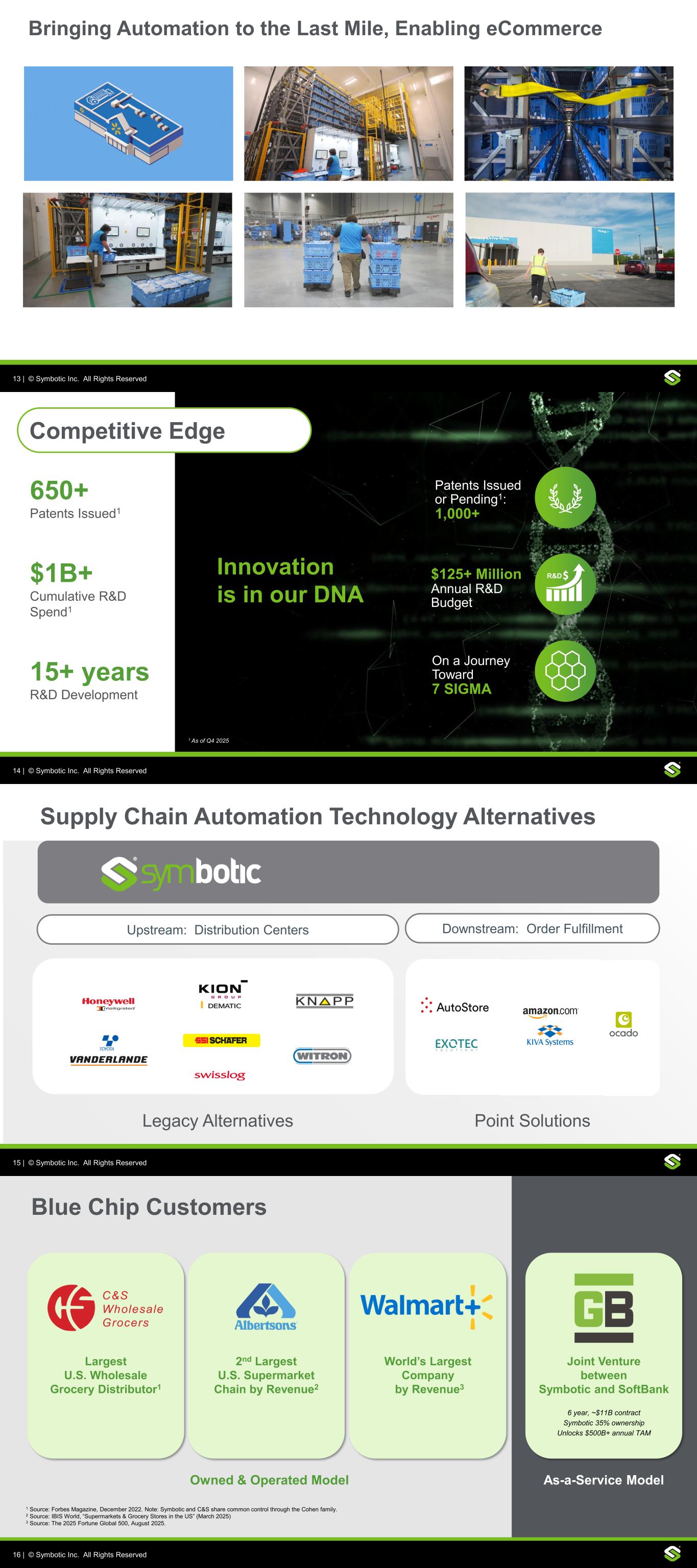 13 | © Symbotic, Inc. All Rights Reserved | Proprietary and Confidential Inc. Al Rights Reserved Bringing Automation to the Last Mile, Enabling eCommerce 14 | © Symbotic, Inc. All Rights Reserved | Proprietary and Confidential Inc. Al Rights Reserved 650+ Patents Issued1 $1B+ Cumulative R&D Spend1 15+ years R&D Development On a Journey Toward 7 SIGMA $125+ Million Annual R&D Budget Innovation is in our DNA Patents Issued or Pending1: 1,000+ Competitive Edge 1 As of Q4 2025 15 | © Symbotic, Inc. All Rights Reserved | Proprietary and Confidential Inc. Al Rights Reserved Supply Chain Automation Technology Alternatives 15 Point Solutions 0 Legacy Alternatives Upstream: Distribution Centers Downstream: Order Fulfillment 16 | © Symbotic, Inc. All Rights Reserved | Proprietary and Confidential Inc. Al Rights Reserved Blue Chip Customers Largest U.S. Wholesale Grocery Distributor1 2nd Largest U.S. Supermarket Chain by Revenue2 World’s Largest Company by Revenue3 1 Source: Forbes Magazine, December 2022. Note: Symbotic and C&S share common control through the Cohen family. 2 Source: IBIS World, “Supermarkets & Grocery Stores in the US” (March 2025) 3 Source: The 2025 Fortune Global 500, August 2025. Joint Venture between Symbotic and SoftBank 6 year, ~$11B contract Symbotic 35% ownership Unlocks $500B+ annual TAM Owned & Operated Model As-a-Service Model