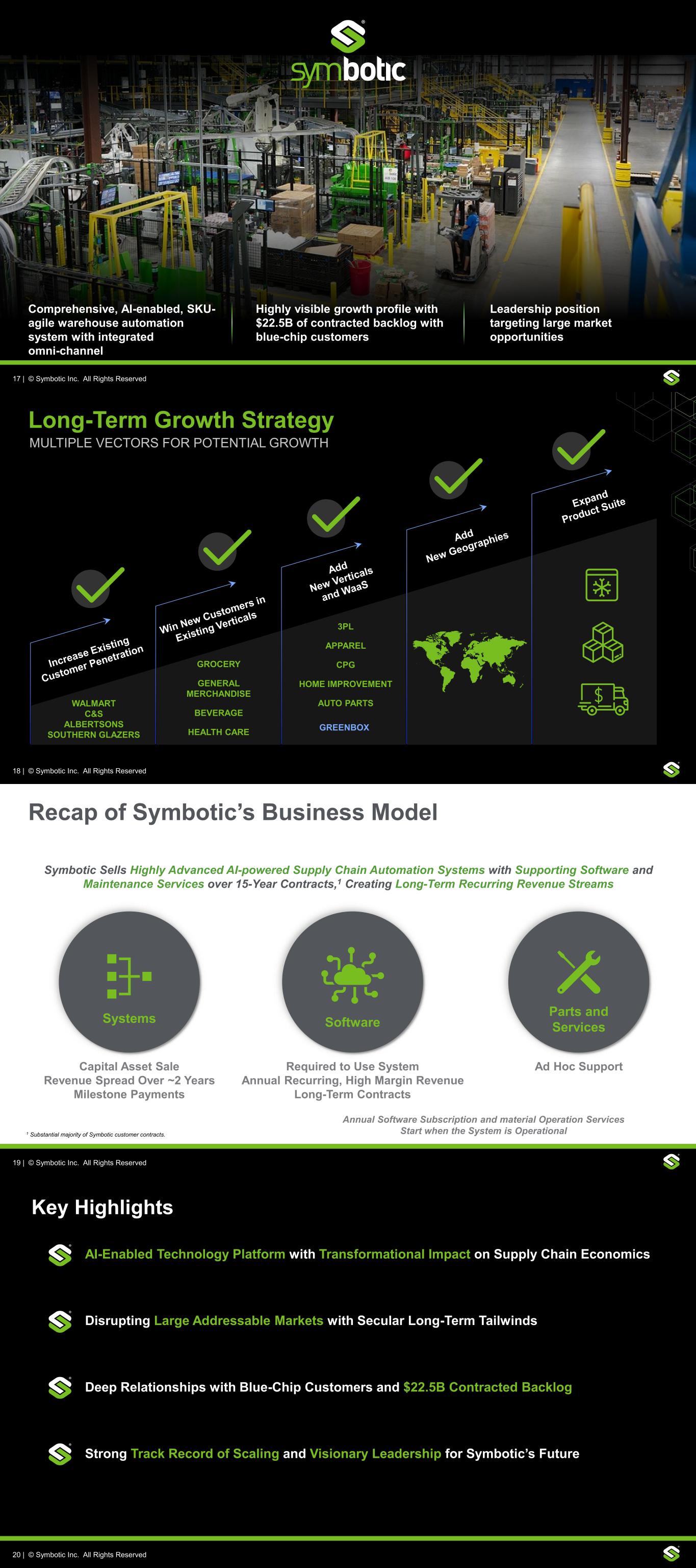 17 | © Symbotic, Inc. All Rights Reserved | Proprietary and Confidential Inc. Al Rights Reserved Comprehensive, AI-enabled, SKU- agile warehouse automation system with integrated omni-channel Highly visible growth profile with $22.5B of contracted backlog with blue-chip customers Leadership position targeting large market opportunities 18 | © Symbotic, Inc. All Rights Reserved | Proprietary and Confidential Inc. Al Rights Reserved Long-Term Growth Strategy MULTIPLE VECTORS FOR POTENTIAL GROWTH GROCERY GENERAL MERCHANDISE BEVERAGE HEALTH CARE 3PL APPAREL CPG HOME IMPROVEMENT AUTO PARTSWALMART C&S ALBERTSONS SOUTHERN GLAZERS GREENBOX 19 | © Symbotic, Inc. All Rights Reserved | Proprietary and Confidential Inc. Al Rights Reserved Recap of Symbotic’s Business Model Symbotic Sells Highly Advanced AI-powered Supply Chain Automation Systems with Supporting Software and Maintenance Services over 15-Year Contracts,1 Creating Long-Term Recurring Revenue Streams SoftwareSystems Parts and Services Capital Asset Sale Revenue Spread Over ~2 Years Milestone Payments Required to Use System Annual Recurring, High Margin Revenue Long-Term Contracts Ad Hoc Support Annual Software Subscription and material Operation Services Start when the System is Operational1 Substantial majority of Symbotic customer contracts. 20 | © Symbotic, Inc. All Rights Reserved | Proprietary and Confidential Inc. Al Rights Reserved AI-Enabled Technology Platform with Transformational Impact on Supply Chain Economics Disrupting Large Addressable Markets with Secular Long-Term Tailwinds Deep Relationships with Blue-Chip Customers and $22.5B Contracted Backlog Strong Track Record of Scaling and Visionary Leadership for Symbotic’s Future Key Highlights