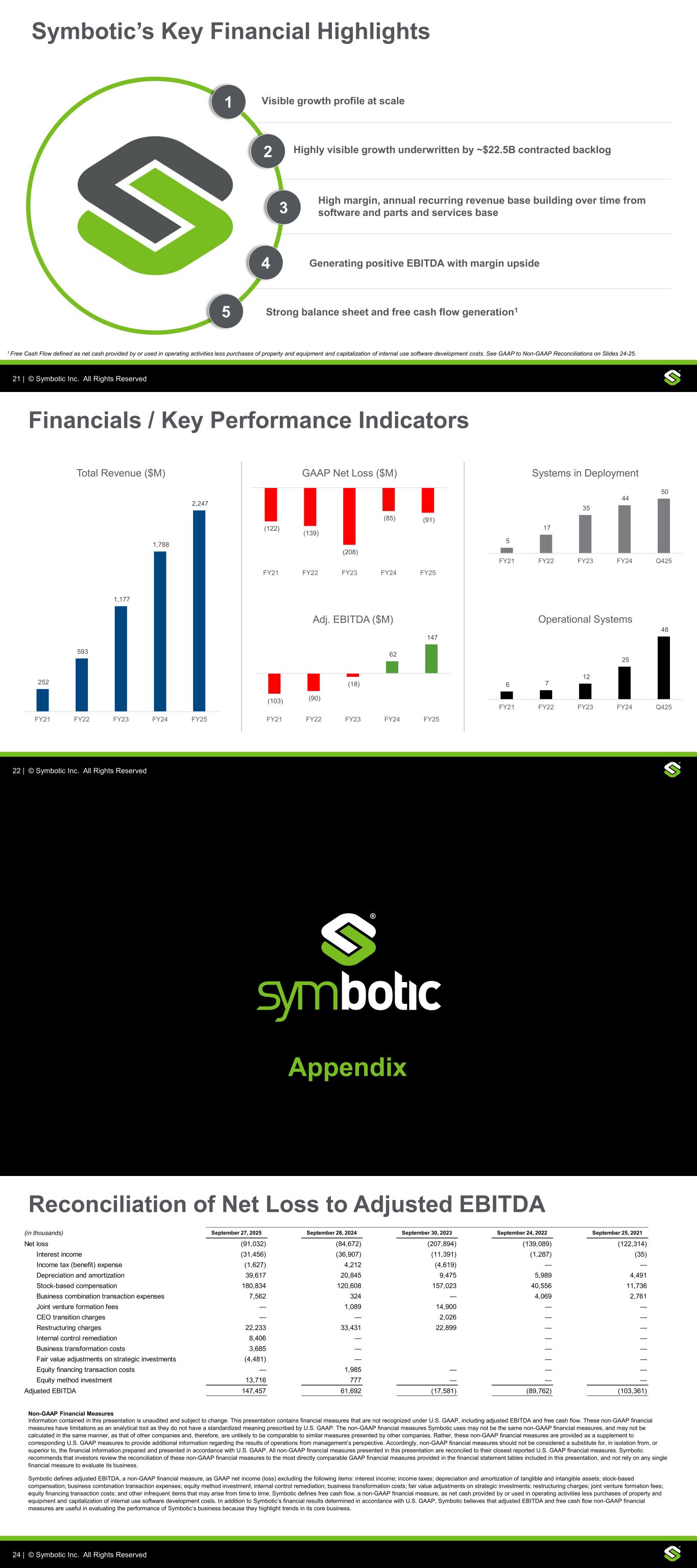 21 | © Symbotic, Inc. All Rights Reserved | Proprietary and Confidential Inc. Al Rights Reserved Symbotic’s Key Financial Highlights High margin, annual recurring revenue base building over time from software and parts and services base Strong balance sheet and free cash flow generation1 Generating positive EBITDA with margin upside Highly visible growth underwritten by ~$22.5B contracted backlog Visible growth profile at scale 5 4 3 2 1 1 Free Cash Flow defined as net cash provided by or used in operating activities less purchases of property and equipment and capitalization of internal use software development costs. See GAAP to Non-GAAP Reconciliations on Slides 24-25. 22 | © Symbotic, Inc. All Rights Reserved | Proprietary and Confidential Inc. Al Rights Reserved Financials / Key Performance Indicators 252 593 1,177 1,788 2,247 FY21 FY22 FY23 FY24 FY25 Total Revenue ($M) (122) (139) (208) (85) (91) FY21 FY22 FY23 FY24 FY25 GAAP Net Loss ($M) 5 17 35 44 50 FY21 FY22 FY23 FY24 Q425 Systems in Deployment 6 7 12 25 48 FY21 FY22 FY23 FY24 Q425 Operational Systems (103) (90) (18) 62 147 FY21 FY22 FY23 FY24 FY25 Adj. EBITDA ($M) Appendix 24 | © Symbotic, Inc. All Rights Reserved | Proprietary and Confidential Inc. Al Rights Reserved Reconciliation of Net Loss to Adjusted EBITDA Non-GAAP Financial Measures Information contained in this presentation is unaudited and subject to change. This presentation contains financial measures that are not recognized under U.S. GAAP, including adjusted EBITDA and free cash flow. These non-GAAP financial measures have limitations as an analytical tool as they do not have a standardized meaning prescribed by U.S. GAAP. The non-GAAP financial measures Symbotic uses may not be the same non-GAAP financial measures, and may not be calculated in the same manner, as that of other companies and, therefore, are unlikely to be comparable to similar measures presented by other companies. Rather, these non-GAAP financial measures are provided as a supplement to corresponding U.S. GAAP measures to provide additional information regarding the results of operations from management’s perspective. Accordingly, non-GAAP financial measures should not be considered a substitute for, in isolation from, or superior to, the financial information prepared and presented in accordance with U.S. GAAP. All non-GAAP financial measures presented in this presentation are reconciled to their closest reported U.S. GAAP financial measures. Symbotic recommends that investors review the reconciliation of these non-GAAP financial measures to the most directly comparable GAAP financial measures provided in the financial statement tables included in this presentation, and not rely on any single financial measure to evaluate its business. Symbotic defines adjusted EBITDA, a non-GAAP financial measure, as GAAP net income (loss) excluding the following items: interest income; income taxes; depreciation and amortization of tanglible and intangible assets; stock-based compensation; business combination transaction expenses; equity method investment; internal control remediation; business transformation costs; fair value adjustments on strategic investments; restructuring charges; joint venture formation fees; equity financing transaction costs; and other infrequent items that may arise from time to time. Symbotic defines free cash flow, a non-GAAP financial measure, as net cash provided by or used in operating activities less purchases of property and equipment and capitalization of internal use software development costs. In addition to Symbotic’s financial results determined in accordance with U.S. GAAP, Symbotic believes that adjusted EBITDA and free cash flow non-GAAP financial measures are useful in evaluating the performance of Symbotic’s business because they highlight trends in its core business. (in thousands) September 27, 2025 September 28, 2024 September 30, 2023 September 24, 2022 September 25, 2021 Net loss (91,032) (84,672) (207,894) (139,089) (122,314) Interest income (31,456) (36,907) (11,391) (1,287) (35) Income tax (benefit) expense (1,627) 4,212 (4,619) — — Depreciation and amortization 39,617 20,845 9,475 5,989 4,491 Stock-based compensation 180,834 120,608 157,023 40,556 11,736 Business combination transaction expenses 7,562 324 — 4,069 2,761 Joint venture formation fees — 1,089 14,900 — — CEO transition charges — — 2,026 — — Restructuring charges 22,233 33,431 22,899 — — Internal control remediation 8,406 — — — Business transformation costs 3,685 — — — Fair value adjustments on strategic investments (4,481) — — — Equity financing transaction costs — 1,985 — — — Equity method investment 13,716 777 — — — Adjusted EBITDA 147,457 61,692 (17,581) (89,762) (103,361)