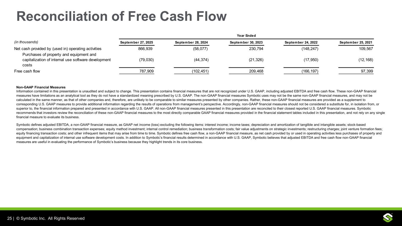 25 | © Symbotic, Inc. All Rights Reserved | Proprietary and Confidential Inc. Al Rights Reserved Reconciliation of Free Cash Flow Non-GAAP Financial Measures Information contained in this presentation is unaudited and subject to change. This presentation contains financial measures that are not recognized under U.S. GAAP, including adjusted EBITDA and free cash flow. These non-GAAP financial measures have limitations as an analytical tool as they do not have a standardized meaning prescribed by U.S. GAAP. The non-GAAP financial measures Symbotic uses may not be the same non-GAAP financial measures, and may not be calculated in the same manner, as that of other companies and, therefore, are unlikely to be comparable to similar measures presented by other companies. Rather, these non-GAAP financial measures are provided as a supplement to corresponding U.S. GAAP measures to provide additional information regarding the results of operations from management’s perspective. Accordingly, non-GAAP financial measures should not be considered a substitute for, in isolation from, or superior to, the financial information prepared and presented in accordance with U.S. GAAP. All non-GAAP financial measures presented in this presentation are reconciled to their closest reported U.S. GAAP financial measures. Symbotic recommends that investors review the reconciliation of these non-GAAP financial measures to the most directly comparable GAAP financial measures provided in the financial statement tables included in this presentation, and not rely on any single financial measure to evaluate its business. Symbotic defines adjusted EBITDA, a non-GAAP financial measure, as GAAP net income (loss) excluding the following items: interest income; income taxes; depreciation and amortization of tanglible and intangible assets; stock-based compensation; business combination transaction expenses; equity method investment; internal control remediation; business transformation costs; fair value adjustments on strategic investments; restructuring charges; joint venture formation fees; equity financing transaction costs; and other infrequent items that may arise from time to time. Symbotic defines free cash flow, a non-GAAP financial measure, as net cash provided by or used in operating activities less purchases of property and equipment and capitalization of internal use software development costs. In addition to Symbotic’s financial results determined in accordance with U.S. GAAP, Symbotic believes that adjusted EBITDA and free cash flow non-GAAP financial measures are useful in evaluating the performance of Symbotic’s business because they highlight trends in its core business. (in thousands) September 27, 2025 September 28, 2024 September 30, 2023 September 24, 2022 September 25, 2021 Net cash provided by (used in) operating activities 866,939 (58,077) 230,794 (148,247) 109,567 Purchases of property and equipment and capitalization of internal use software development costs (79,030) (44,374) (21,326) (17,950) (12,168) Free cash flow 787,909 (102,451) 209,468 (166,197) 97,399 Year Ended