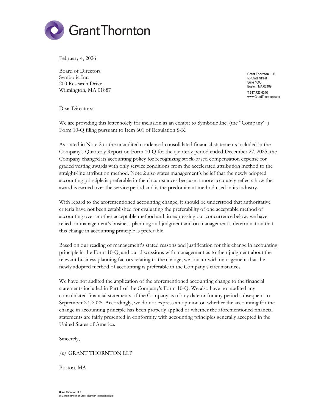 Grant Thornton LLP 53 State Street Suite 1600 Boston, MA 02109 T 617.723.6340 www.GrantThornton.com Grant Thornton LLP U.S. member firm of Grant Thornton International Ltd February 4, 2026 Dear Directors: We are providing this letter solely for inclusion as an exhibit to Symbotic Inc. (the “Company”") Form 10-Q filing pursuant to Item 601 of Regulation S-K. As stated in Note 2 to the unaudited condensed consolidated financial statements included in the Company’s Quarterly Report on Form 10-Q for the quarterly period ended December 27, 2025, the Company changed its accounting policy for recognizing stock-based compensation expense for graded vesting awards with only service conditions from the accelerated attribution method to the straight-line attribution method. Note 2 also states management’s belief that the newly adopted accounting principle is preferable in the circumstances because it more accurately reflects how the award is earned over the service period and is the predominant method used in its industry. With regard to the aforementioned accounting change, it should be understood that authoritative criteria have not been established for evaluating the preferability of one acceptable method of accounting over another acceptable method and, in expressing our concurrence below, we have relied on management’s business planning and judgment and on management’s determination that this change in accounting principle is preferable. Based on our reading of management’s stated reasons and justification for this change in accounting principle in the Form 10-Q, and our discussions with management as to their judgment about the relevant business planning factors relating to the change, we concur with management that the newly adopted method of accounting is preferable in the Company’s circumstances. We have not audited the application of the aforementioned accounting change to the financial statements included in Part I of the Company’s Form 10-Q. We also have not audited any consolidated financial statements of the Company as of any date or for any period subsequent to September 27, 2025. Accordingly, we do not express an opinion on whether the accounting for the change in accounting principle has been properly applied or whether the aforementioned financial statements are fairly presented in conformity with accounting principles generally accepted in the United States of America. Sincerely, /s/ GRANT THORNTON LLP Boston, MA Board of Directors Symbotic Inc. 200 Research Drive, Wilmington, MA 01887