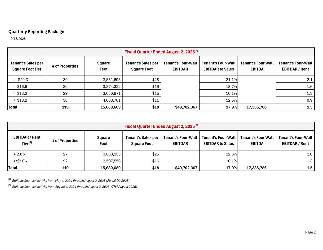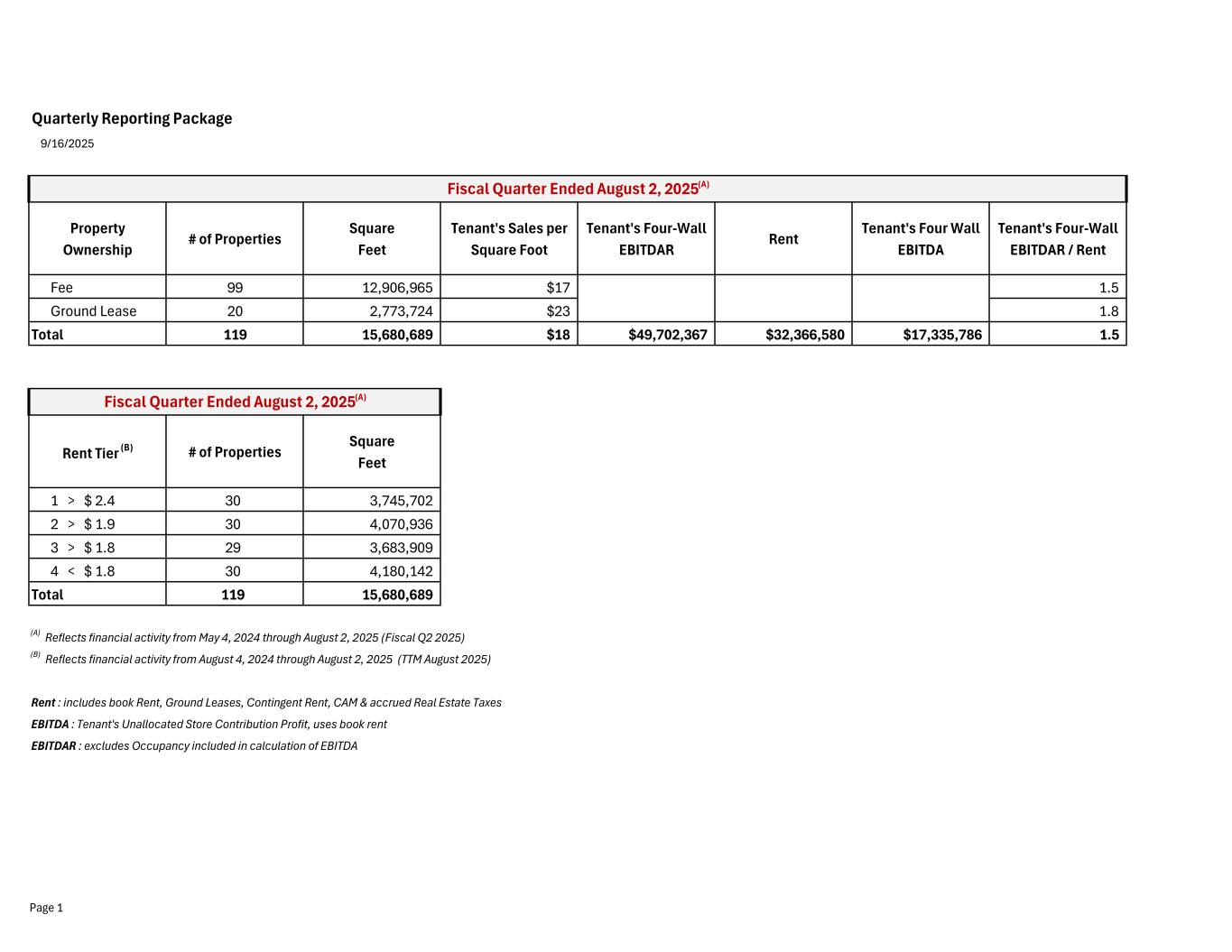Quarterly Reporting Package 9/16/2025 Property Ownership # of Properties Square Feet Tenant's Sales per Square Foot Tenant's Four-Wall EBITDAR Rent Tenant's Four Wall EBITDA Tenant's Four-Wall EBITDAR / Rent Fee 99 12,906,965 $17 $37,225,057 $25,295,207 $11,929,850 1.5 Ground Lease 20 2,773,724 $23 $12,477,309 $7,071,373 $5,405,936 1.8 Total 119 15,680,689 $18 $49,702,367 $32,366,580 $17,335,786 1.5 Rent Tier (B) # of Properties Square Feet 1 > $ 2.4 30 3,745,702 2 > $ 1.9 30 4,070,936 3 > $ 1.8 29 3,683,909 4 < $ 1.8 30 4,180,142 Total 119 15,680,689 (A) Reflects financial activity from May 4, 2024 through August 2, 2025 (Fiscal Q2 2025) (B) Reflects financial activity from August 4, 2024 through August 2, 2025 (TTM August 2025) Rent : includes book Rent, Ground Leases, Contingent Rent, CAM & accrued Real Estate Taxes EBITDA : Tenant's Unallocated Store Contribution Profit, uses book rent EBITDAR : excludes Occupancy included in calculation of EBITDA Fiscal Quarter Ended August 2, 2025(A) Fiscal Quarter Ended August 2, 2025(A) Page 1