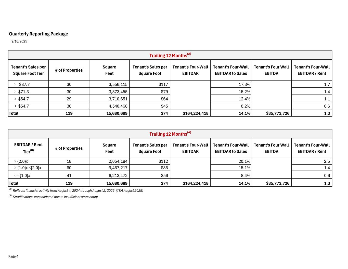 Quarterly Reporting Package 9/16/2025 Property Ownership # of Properties Square Feet Tenant's Sales per Square Foot Tenant's Four-Wall EBITDAR Rent Tenant's Four Wall EBITDA Tenant's Four-Wall EBITDAR / Rent Fee 99 12,906,965 $70 $124,294,753 $100,259,437 $24,035,316 1.2 Ground Lease 20 2,773,724 $91 $39,929,665 $28,191,255 $11,738,410 1.4 Total 119 15,680,689 $74 $164,224,418 $128,450,692 $35,773,726 1.3 Rent Tier (A) # of Properties Square Feet Tenant's Sales per Square Foot Tenant's Four-Wall EBITDAR Rent Tenant's Four Wall EBITDA Tenant's Four-Wall EBITDAR / Rent 1 > $ 9.6 30 3,767,728 $106 $65,557,707 $45,465,569 1.4 2 > $ 7.6 30 4,112,967 $69 $41,086,279 $34,908,335 1.2 3 > $ 6.9 29 3,677,425 $74 $38,851,765 $26,609,409 1.5 4 < $ 6.9 30 4,122,569 $49 $18,728,668 $21,467,379 0.9 Total 119 15,680,689 $74 $164,224,418 $128,450,692 $35,773,726 1.3 (A) Reflects financial activity from May 4, 2024 through August 2, 2025 (Fiscal Q2 2025) (B) Reflects financial activity from August 4, 2024 through August 2, 2025 (TTM August 2025) Rent : includes book Rent, Ground Leases, Contingent Rent, CAM & accrued Real Estate Taxes EBITDA : Tenant's Unallocated Store Contribution Profit, uses book rent EBITDAR : excludes Occupancy included in calculation of EBITDA Trailing 12 Months(B) Trailing 12 Months(B) Page 3