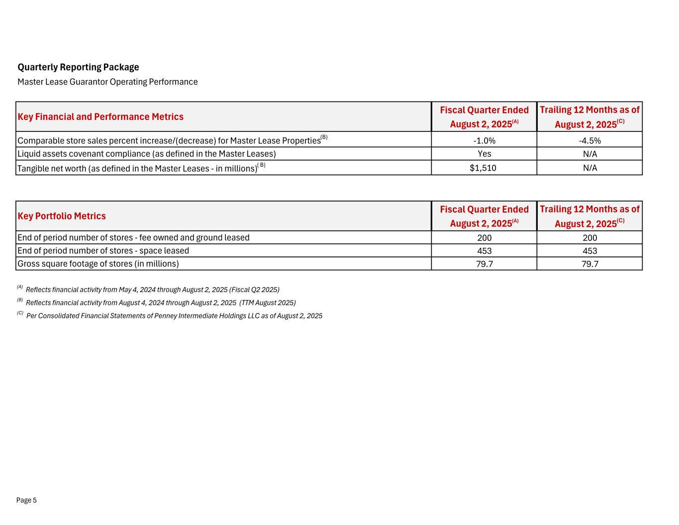 Quarterly Reporting Package Master Lease Guarantor Operating Performance Fiscal Quarter Ended August 2, 2025(A) Trailing 12 Months as of August 2, 2025(C) -1.0% -4.5% Yes N/A $1,510 N/A Fiscal Quarter Ended August 2, 2025(A) Trailing 12 Months as of August 2, 2025(C) 200 200 453 453 79.7 79.7 (A) Reflects financial activity from May 4, 2024 through August 2, 2025 (Fiscal Q2 2025) (B) Reflects financial activity from August 4, 2024 through August 2, 2025 (TTM August 2025) (C) Per Consolidated Financial Statements of Penney Intermediate Holdings LLC as of August 2, 2025 End of period number of stores - space leased Gross square footage of stores (in millions) Key Financial and Performance Metrics Comparable store sales percent increase/(decrease) for Master Lease Properties(B) Liquid assets covenant compliance (as defined in the Master Leases) Tangible net worth (as defined in the Master Leases - in millions)( B) Key Portfolio Metrics End of period number of stores - fee owned and ground leased Page 5