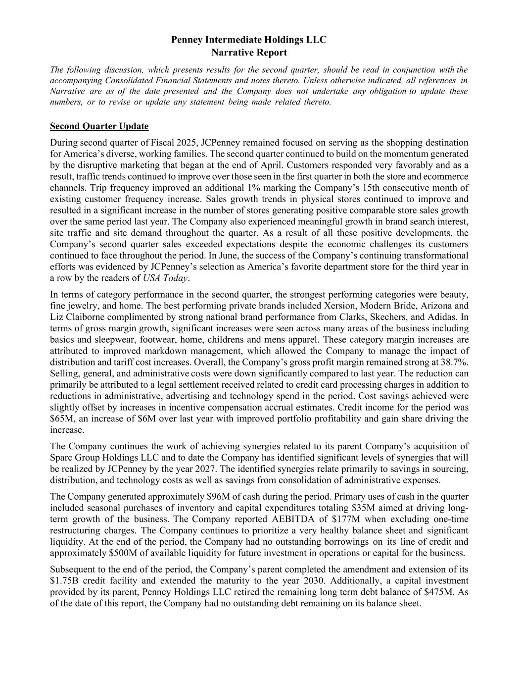 Penney Intermediate Holdings LLC Narrative Report The following discussion, which presents results for the second quarter, should be read in conjunction with the accompanying Consolidated Financial Statements and notes thereto. Unless otherwise indicated, all references in Narrative are as of the date presented and the Company does not undertake any obligation to update these numbers, or to revise or update any statement being made related thereto. Second Quarter Update During second quarter of Fiscal 2025, JCPenney remained focused on serving as the shopping destination for America’s diverse, working families. The second quarter continued to build on the momentum generated by the disruptive marketing that began at the end of April. Customers responded very favorably and as a result, traffic trends continued to improve over those seen in the first quarter in both the store and ecommerce channels. Trip frequency improved an additional 1% marking the Company’s 15th consecutive month of existing customer frequency increase. Sales growth trends in physical stores continued to improve and resulted in a significant increase in the number of stores generating positive comparable store sales growth over the same period last year. The Company also experienced meaningful growth in brand search interest, site traffic and site demand throughout the quarter. As a result of all these positive developments, the Company’s second quarter sales exceeded expectations despite the economic challenges its customers continued to face throughout the period. In June, the success of the Company’s continuing transformational efforts was evidenced by JCPenney’s selection as America’s favorite department store for the third year in a row by the readers of USA Today. In terms of category performance in the second quarter, the strongest performing categories were beauty, fine jewelry, and home. The best performing private brands included Xersion, Modern Bride, Arizona and Liz Claiborne complimented by strong national brand performance from Clarks, Skechers, and Adidas. In terms of gross margin growth, significant increases were seen across many areas of the business including basics and sleepwear, footwear, home, childrens and mens apparel. These category margin increases are attributed to improved markdown management, which allowed the Company to manage the impact of distribution and tariff cost increases. Overall, the Company’s gross profit margin remained strong at 38.7%. Selling, general, and administrative costs were down significantly compared to last year. The reduction can primarily be attributed to a legal settlement received related to credit card processing charges in addition to reductions in administrative, advertising and technology spend in the period. Cost savings achieved were slightly offset by increases in incentive compensation accrual estimates. Credit income for the period was $65M, an increase of $6M over last year with improved portfolio profitability and gain share driving the increase. The Company continues the work of achieving synergies related to its parent Company’s acquisition of Sparc Group Holdings LLC and to date the Company has identified significant levels of synergies that will be realized by JCPenney by the year 2027. The identified synergies relate primarily to savings in sourcing, distribution, and technology costs as well as savings from consolidation of administrative expenses. The Company generated approximately $96M of cash during the period. Primary uses of cash in the quarter included seasonal purchases of inventory and capital expenditures totaling $35M aimed at driving long- term growth of the business. The Company reported AEBITDA of $177M when excluding one-time restructuring charges. The Company continues to prioritize a very healthy balance sheet and significant liquidity. At the end of the period, the Company had no outstanding borrowings on its line of credit and approximately $500M of available liquidity for future investment in operations or capital for the business. Subsequent to the end of the period, the Company’s parent completed the amendment and extension of its $1.75B credit facility and extended the maturity to the year 2030. Additionally, a capital investment provided by its parent, Penney Holdings LLC retired the remaining long term debt balance of $475M. As of the date of this report, the Company had no outstanding debt remaining on its balance sheet.