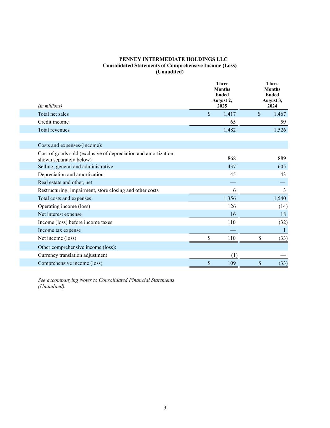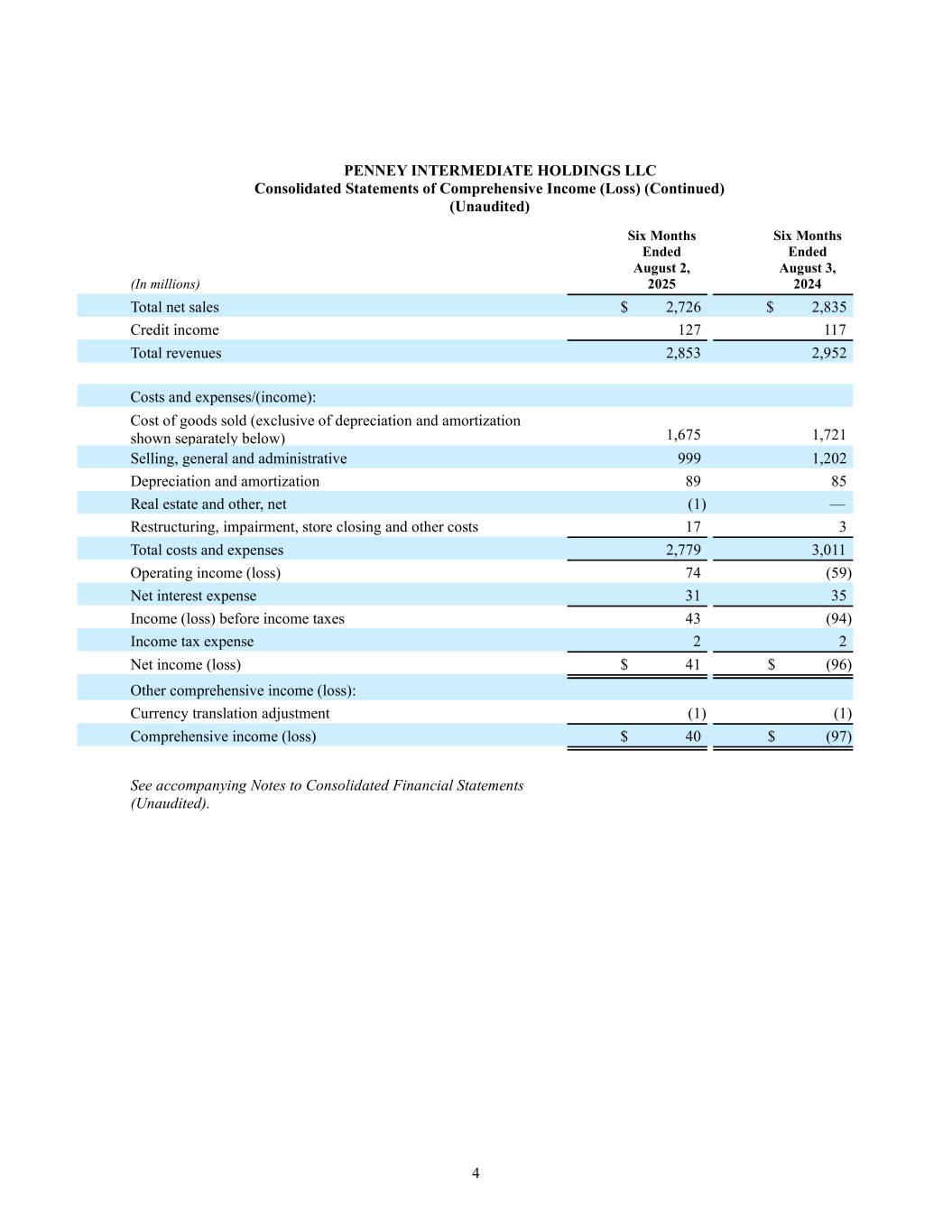 4 PENNEY INTERMEDIATE HOLDINGS LLC Consolidated Statements of Comprehensive Income (Loss) (Continued) (Unaudited) (In millions) Six Months Ended August 2, 2025 Six Months Ended August 3, 2024 Total net sales $ 2,726 $ 2,835 Credit income 127 117 Total revenues 2,853 2,952 Costs and expenses/(income): Cost of goods sold (exclusive of depreciation and amortization shown separately below) 1,675 1,721 Selling, general and administrative 999 1,202 Depreciation and amortization 89 85 Real estate and other, net (1) — Restructuring, impairment, store closing and other costs 17 3 Total costs and expenses 2,779 3,011 Operating income (loss) 74 (59) Net interest expense 31 35 Income (loss) before income taxes 43 (94) Income tax expense 2 2 Net income (loss) $ 41 $ (96) Other comprehensive income (loss): Currency translation adjustment (1) (1) Comprehensive income (loss) $ 40 $ (97) See accompanying Notes to Consolidated Financial Statements (Unaudited).