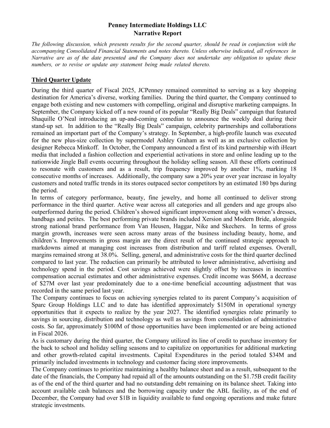 Penney Intermediate Holdings LLC Narrative Report The following discussion, which presents results for the second quarter, should be read in conjunction with the accompanying Consolidated Financial Statements and notes thereto. Unless otherwise indicated, all references in Narrative are as of the date presented and the Company does not undertake any obligation to update these numbers, or to revise or update any statement being made related thereto. Third Quarter Update During the third quarter of Fiscal 2025, JCPenney remained committed to serving as a key shopping destination for America’s diverse, working families. During the third quarter, the Company continued to engage both existing and new customers with compelling, original and disruptive marketing campaigns. In September, the Company kicked off a new round of its popular “Really Big Deals” campaign that featured Shaquille O’Neal introducing an up-and-coming comedian to announce the weekly deal during their stand-up set. In addition to the “Really Big Deals” campaign, celebrity partnerships and collaborations remained an important part of the Company’s strategy. In September, a high-profile launch was executed for the new plus-size collection by supermodel Ashley Graham as well as an exclusive collection by designer Rebecca Minkoff. In October, the Company announced a first of its kind partnership with iHeart media that included a fashion collection and experiential activations in store and online leading up to the nationwide Jingle Ball events occurring throughout the holiday selling season. All these efforts continued to resonate with customers and as a result, trip frequency improved by another 1%, marking 18 consecutive months of increases. Additionally, the company saw a 20% year over year increase in loyalty customers and noted traffic trends in its stores outpaced sector competitors by an estimated 180 bps during the period. In terms of category performance, beauty, fine jewelry, and home all continued to deliver strong performance in the third quarter. Active wear across all categories and all genders and age groups also outperformed during the period. Children’s showed significant improvement along with women’s dresses, handbags and petites. The best performing private brands included Xersion and Modern Bride, alongside strong national brand performance from Van Heusen, Haggar, Nike and Skechers. In terms of gross margin growth, increases were seen across many areas of the business including beauty, home, and children’s. Improvements in gross margin are the direct result of the continued strategic approach to markdowns aimed at managing cost increases from distribution and tariff related expenses. Overall, margins remained strong at 38.0%. Selling, general, and administrative costs for the third quarter declined compared to last year. The reduction can primarily be attributed to lower administrative, advertising and technology spend in the period. Cost savings achieved were slightly offset by increases in incentive compensation accrual estimates and other administrative expenses. Credit income was $66M, a decrease of $27M over last year predominately due to a one-time beneficial accounting adjustment that was recorded in the same period last year. The Company continues to focus on achieving synergies related to its parent Company’s acquisition of Sparc Group Holdings LLC and to date has identified approximately $150M in operational synergy opportunities that it expects to realize by the year 2027. The identified synergies relate primarily to savings in sourcing, distribution and technology as well as savings from consolidation of administrative costs. So far, approximately $100M of those opportunities have been implemented or are being actioned in Fiscal 2026. As is customary during the third quarter, the Company utilized its line of credit to purchase inventory for the back to school and holiday selling seasons and to capitalize on opportunities for additional marketing and other growth-related capital investments. Capital Expenditures in the period totaled $34M and primarily included investments in technology and customer facing store improvements. The Company continues to prioritize maintaining a healthy balance sheet and as a result, subsequent to the date of the financials, the Company had repaid all of the amounts outstanding on the $1.75B credit facility as of the end of the third quarter and had no outstanding debt remaining on its balance sheet. Taking into account available cash balances and the borrowing capacity under the ABL facility, as of the end of December, the Company had over $1B in liquidity available to fund ongoing operations and make future strategic investments.