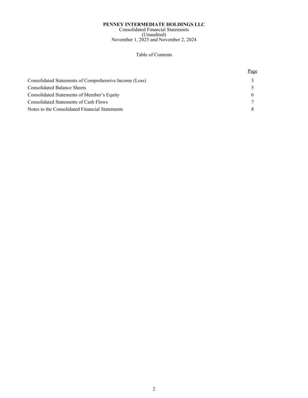 PENNEY INTERMEDIATE HOLDINGS LLC Consolidated Financial Statements (Unaudited) November 1, 2025 and November 2, 2024 Table of Contents Page Consolidated Statements of Comprehensive Income (Loss) 3 Consolidated Balance Sheets 5 Consolidated Statements of Member’s Equity 6 Consolidated Statements of Cash Flows 7 Notes to the Consolidated Financial Statements 8 2