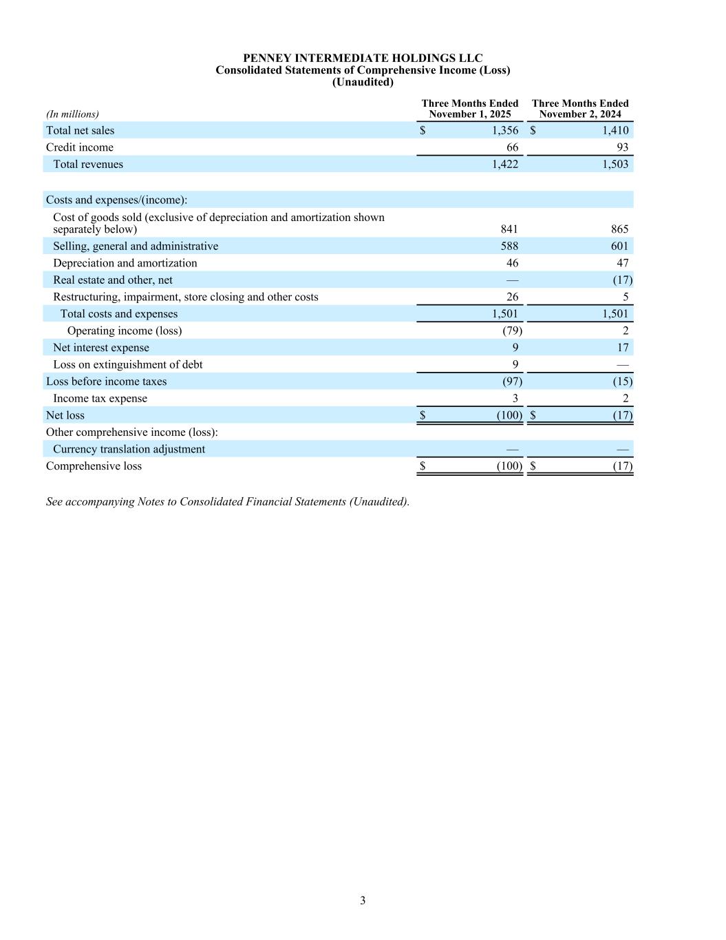 PENNEY INTERMEDIATE HOLDINGS LLC Consolidated Statements of Comprehensive Income (Loss) (Unaudited) (In millions) Three Months Ended November 1, 2025 Three Months Ended November 2, 2024 Total net sales $ 1,356 $ 1,410 Credit income 66 93 Total revenues 1,422 1,503 Costs and expenses/(income): Cost of goods sold (exclusive of depreciation and amortization shown separately below) 841 865 Selling, general and administrative 588 601 Depreciation and amortization 46 47 Real estate and other, net — (17) Restructuring, impairment, store closing and other costs 26 5 Total costs and expenses 1,501 1,501 Operating income (loss) (79) 2 Net interest expense 9 17 Loss on extinguishment of debt 9 — Loss before income taxes (97) (15) Income tax expense 3 2 Net loss $ (100) $ (17) Other comprehensive income (loss): Currency translation adjustment — — Comprehensive loss $ (100) $ (17) See accompanying Notes to Consolidated Financial Statements (Unaudited). 3