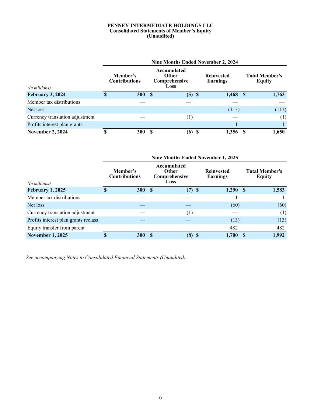 PENNEY INTERMEDIATE HOLDINGS LLC Consolidated Statements of Member’s Equity (Unaudited) Nine Months Ended November 2, 2024 (In millions) Member’s Contributions Accumulated Other Comprehensive Loss Reinvested Earnings Total Member's Equity February 3, 2024 $ 300 $ (5) $ 1,468 $ 1,763 Member tax distributions — — — — Net loss — — (113) (113) Currency translation adjustment — (1) — (1) Profits interest plan grants — — 1 1 November 2, 2024 $ 300 $ (6) $ 1,356 $ 1,650 Nine Months Ended November 1, 2025 (In millions) Member’s Contributions Accumulated Other Comprehensive Loss Reinvested Earnings Total Member's Equity February 1, 2025 $ 300 $ (7) $ 1,290 $ 1,583 Member tax distributions — — 1 1 Net loss — — (60) (60) Currency translation adjustment — (1) — (1) Profits interest plan grants reclass — — (13) (13) Equity transfer from parent — — 482 482 November 1, 2025 $ 300 $ (8) $ 1,700 $ 1,992 See accompanying Notes to Consolidated Financial Statements (Unaudited). 6