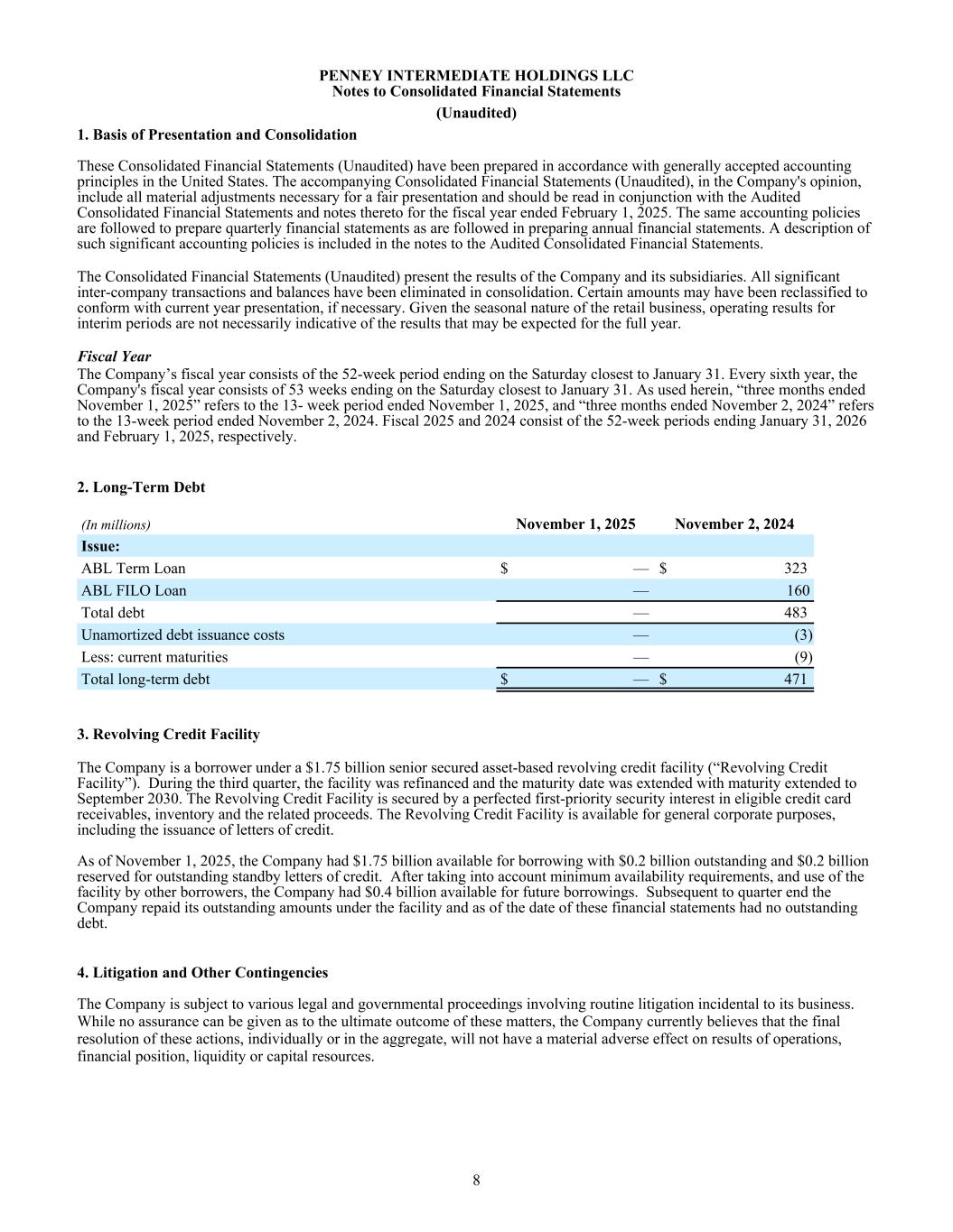 PENNEY INTERMEDIATE HOLDINGS LLC Notes to Consolidated Financial Statements (Unaudited) 1. Basis of Presentation and Consolidation These Consolidated Financial Statements (Unaudited) have been prepared in accordance with generally accepted accounting principles in the United States. The accompanying Consolidated Financial Statements (Unaudited), in the Company's opinion, include all material adjustments necessary for a fair presentation and should be read in conjunction with the Audited Consolidated Financial Statements and notes thereto for the fiscal year ended February 1, 2025. The same accounting policies are followed to prepare quarterly financial statements as are followed in preparing annual financial statements. A description of such significant accounting policies is included in the notes to the Audited Consolidated Financial Statements. The Consolidated Financial Statements (Unaudited) present the results of the Company and its subsidiaries. All significant inter-company transactions and balances have been eliminated in consolidation. Certain amounts may have been reclassified to conform with current year presentation, if necessary. Given the seasonal nature of the retail business, operating results for interim periods are not necessarily indicative of the results that may be expected for the full year. Fiscal Year The Company’s fiscal year consists of the 52-week period ending on the Saturday closest to January 31. Every sixth year, the Company's fiscal year consists of 53 weeks ending on the Saturday closest to January 31. As used herein, “three months ended November 1, 2025” refers to the 13- week period ended November 1, 2025, and “three months ended November 2, 2024” refers to the 13-week period ended November 2, 2024. Fiscal 2025 and 2024 consist of the 52-week periods ending January 31, 2026 and February 1, 2025, respectively. 2. Long-Term Debt (In millions) November 1, 2025 November 2, 2024 Issue: ABL Term Loan $ — $ 323 ABL FILO Loan — 160 Total debt — 483 Unamortized debt issuance costs — (3) Less: current maturities — (9) Total long-term debt $ — $ 471 3. Revolving Credit Facility The Company is a borrower under a $1.75 billion senior secured asset-based revolving credit facility (“Revolving Credit Facility”). During the third quarter, the facility was refinanced and the maturity date was extended with maturity extended to September 2030. The Revolving Credit Facility is secured by a perfected first-priority security interest in eligible credit card receivables, inventory and the related proceeds. The Revolving Credit Facility is available for general corporate purposes, including the issuance of letters of credit. As of November 1, 2025, the Company had $1.75 billion available for borrowing with $0.2 billion outstanding and $0.2 billion reserved for outstanding standby letters of credit. After taking into account minimum availability requirements, and use of the facility by other borrowers, the Company had $0.4 billion available for future borrowings. Subsequent to quarter end the Company repaid its outstanding amounts under the facility and as of the date of these financial statements had no outstanding debt. 4. Litigation and Other Contingencies The Company is subject to various legal and governmental proceedings involving routine litigation incidental to its business. While no assurance can be given as to the ultimate outcome of these matters, the Company currently believes that the final resolution of these actions, individually or in the aggregate, will not have a material adverse effect on results of operations, financial position, liquidity or capital resources. 8