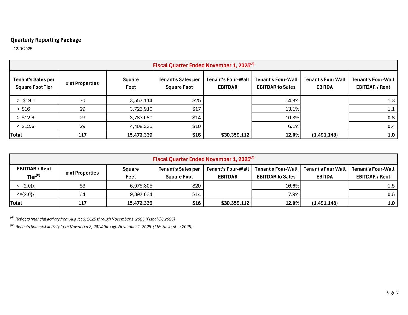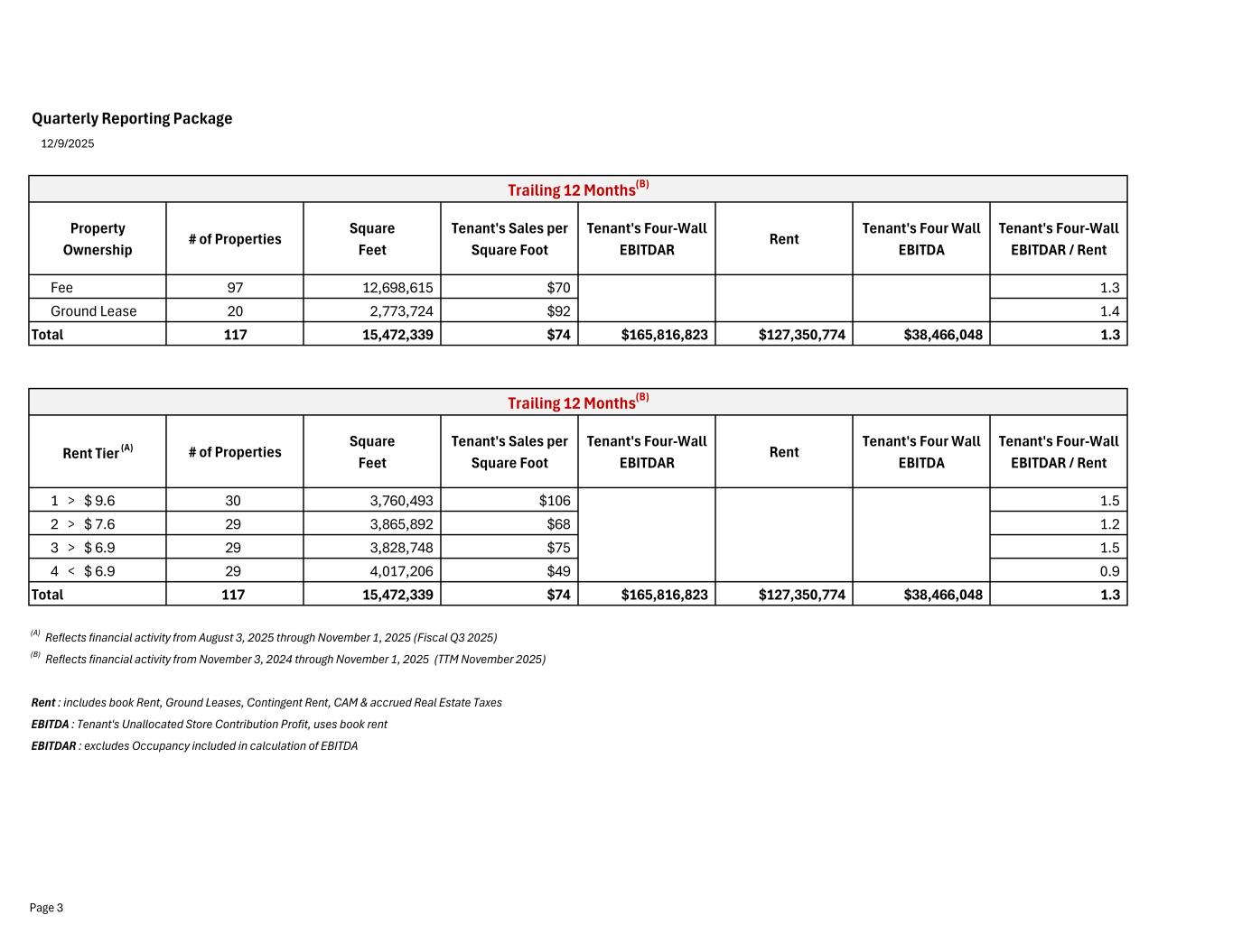 Quarterly Reporting Package 12/9/2025 Property Ownership # of Properties Square Feet Tenant's Sales per Square Foot Tenant's Four-Wall EBITDAR Rent Tenant's Four Wall EBITDA Tenant's Four-Wall EBITDAR / Rent Fee 97 12,698,615 $16 $22,441,232 $24,828,557 ($2,387,325) 0.9 Ground Lease 20 2,773,724 $20 $7,917,880 $7,021,704 $896,176 1.1 Total 117 15,472,339 $16 $30,359,112 $31,850,261 ($1,491,148) 1.0 Rent Tier (B) # of Properties Square Feet 1 > $ 2.4 30 3,738,467 2 > $ 1.9 29 3,782,384 3 > $ 1.8 29 3,876,709 4 < $ 1.8 29 4,074,779 Total 117 15,472,339 (A) Reflects financial activity from August 3, 2025 through November 1, 2025 (Fiscal Q3 2025) (B) Reflects financial activity from November 3, 2024 through November 1, 2025 (TTM November 2025) Rent : includes book Rent, Ground Leases, Contingent Rent, CAM & accrued Real Estate Taxes EBITDA : Tenant's Unallocated Store Contribution Profit, uses book rent EBITDAR : excludes Occupancy included in calculation of EBITDA Fiscal Quarter Ended November 1, 2025(A) Fiscal Quarter Ended November 1, 2025(A) Page 1