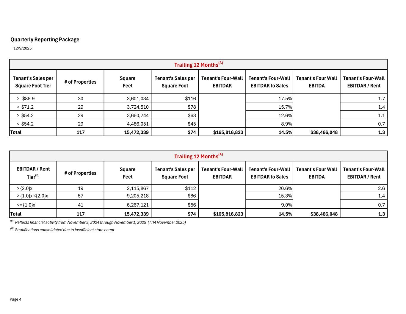 Quarterly Reporting Package 12/9/2025 Property Ownership # of Properties Square Feet Tenant's Sales per Square Foot Tenant's Four-Wall EBITDAR Rent Tenant's Four Wall EBITDA Tenant's Four-Wall EBITDAR / Rent Fee 97 12,698,615 $70 $124,643,338 $98,917,814 $25,725,525 1.3 Ground Lease 20 2,773,724 $92 $41,173,485 $28,432,961 $12,740,524 1.4 Total 117 15,472,339 $74 $165,816,823 $127,350,774 $38,466,048 1.3 Rent Tier (A) # of Properties Square Feet Tenant's Sales per Square Foot Tenant's Four-Wall EBITDAR Rent Tenant's Four Wall EBITDA Tenant's Four-Wall EBITDAR / Rent 1 > $ 9.6 30 3,760,493 $106 $66,513,419 $45,744,058 1.5 2 > $ 7.6 29 3,865,892 $68 $38,338,693 $32,976,343 1.2 3 > $ 6.9 29 3,828,748 $75 $41,780,310 $27,824,073 1.5 4 < $ 6.9 29 4,017,206 $49 $19,184,401 $20,806,301 0.9 Total 117 15,472,339 $74 $165,816,823 $127,350,774 $38,466,048 1.3 (A) Reflects financial activity from August 3, 2025 through November 1, 2025 (Fiscal Q3 2025) (B) Reflects financial activity from November 3, 2024 through November 1, 2025 (TTM November 2025) Rent : includes book Rent, Ground Leases, Contingent Rent, CAM & accrued Real Estate Taxes EBITDA : Tenant's Unallocated Store Contribution Profit, uses book rent EBITDAR : excludes Occupancy included in calculation of EBITDA Trailing 12 Months(B) Trailing 12 Months(B) Page 3