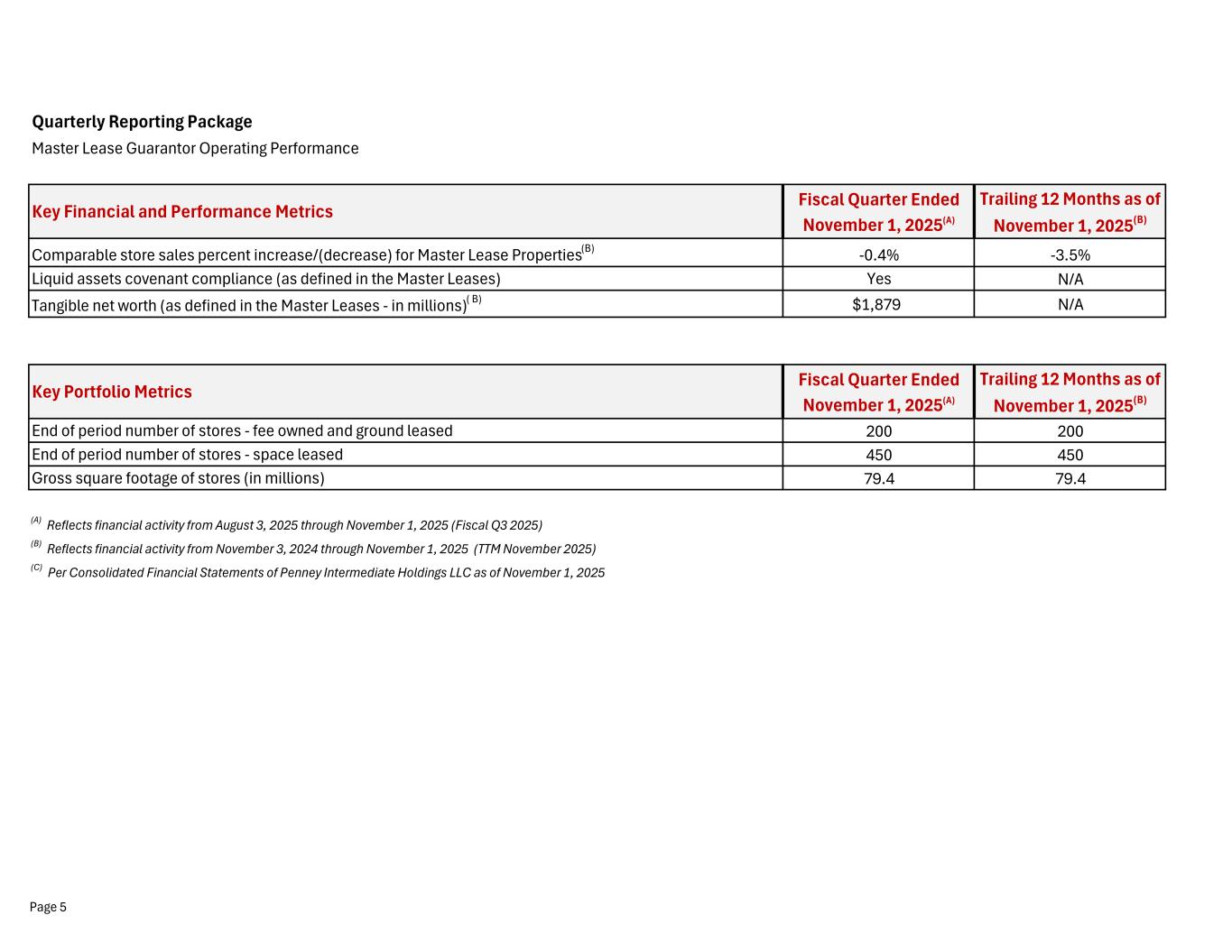 Quarterly Reporting Package Master Lease Guarantor Operating Performance Fiscal Quarter Ended November 1, 2025(A) Trailing 12 Months as of November 1, 2025(B) -0.4% -3.5% Yes N/A $1,879 N/A Fiscal Quarter Ended November 1, 2025(A) Trailing 12 Months as of November 1, 2025(B) 200 200 450 450 79.4 79.4 (A) Reflects financial activity from August 3, 2025 through November 1, 2025 (Fiscal Q3 2025) (B) Reflects financial activity from November 3, 2024 through November 1, 2025 (TTM November 2025) (C) Per Consolidated Financial Statements of Penney Intermediate Holdings LLC as of November 1, 2025 End of period number of stores - space leased Gross square footage of stores (in millions) Key Financial and Performance Metrics Comparable store sales percent increase/(decrease) for Master Lease Properties(B) Liquid assets covenant compliance (as defined in the Master Leases) Tangible net worth (as defined in the Master Leases - in millions)( B) Key Portfolio Metrics End of period number of stores - fee owned and ground leased Page 5