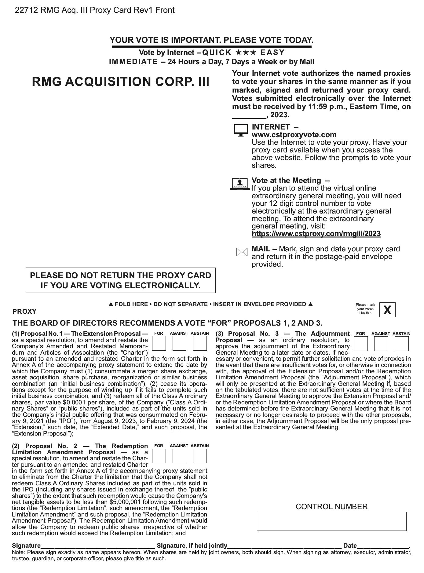 The Sponsor, the Company’s directors, officers and initial shareholders and their permitted transferees (collectively, the “Initial Shareholders”) are expected to vote any Class A Ordinary Shares and Class B Ordinary Shares (together, the “Ordinary Shares”) over which they have voting control in favor of the Extension Proposal, the Redemption Limitation Amendment Proposal and, if presented, the Adjournment Proposal.