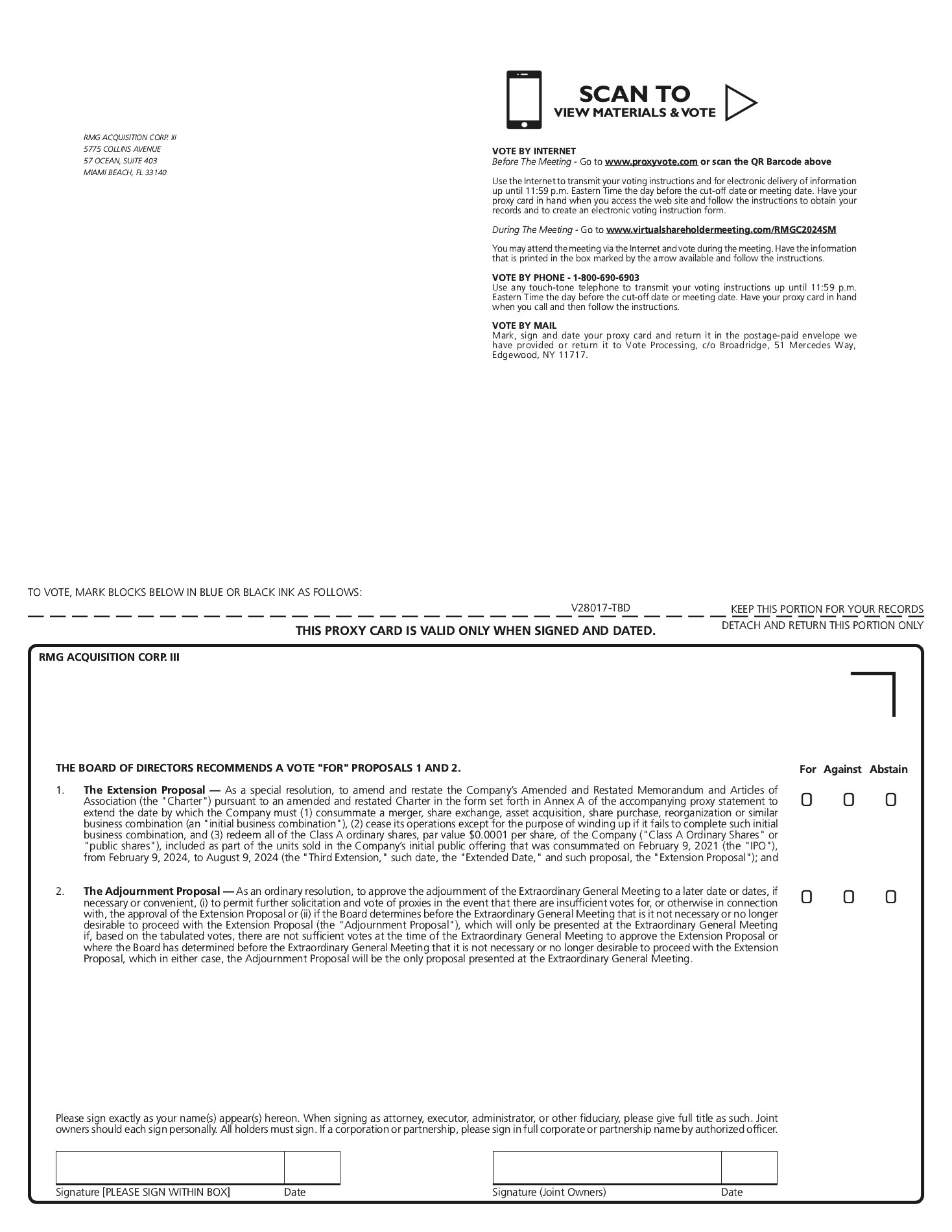 You are cordially invited to attend the Extraordinary General Meeting (the “Extraordinary General Meeting”) of RMG Acquisition Corp. III, a Cayman Islands exempted company (the “Company,” “RMG III,” “we,” “us” or “our”), to be held on ______, 2024, at ______, Eastern Time, at the offices of Latham & Watkins LLP, located at 811 Main St., Suite 3700, Houston, Texas 77002, or at such other time, on such other date and at such other place to which the meeting may be postponed or adjourned, or to attend virtually via the Internet. You will be able to attend the Extraordinary General Meeting online, vote, and submit your questions during the Extraordinary General Meeting by visiting https://www.cstproxy.com/rmgiii/2024. While shareholders are encouraged to attend the meeting virtually, you will be permitted to attend the Extraordinary General Meeting in person at the offices of Latham & Watkins LLP. The accompanying proxy statement is dated ______, 2024, and is first being mailed to shareholders of the Company on or about ______, 2024.