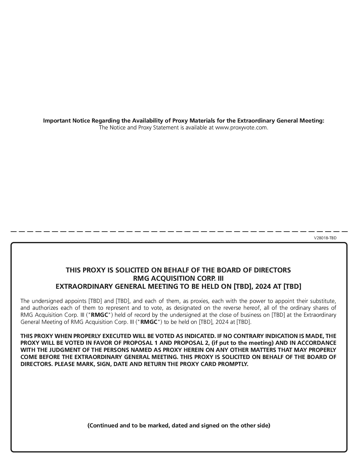 NOTICE IS HEREBY GIVEN that an Extraordinary General Meeting (the “Extraordinary General Meeting”) of RMG Acquisition Corp. III, a Cayman Islands exempted company (the “Company”), will be held on ______, 2024, at ______, Eastern Time, at the offices of Latham & Watkins LLP, located at 811 Main St., Suite 3700, Houston, Texas 77002, or at such other time, on such other date and at such other place to which the meeting may be postponed or adjourned, and will be available to attend virtually via the Internet. You will be able to attend the Extraordinary General Meeting online, vote and submit your questions during the Extraordinary General Meeting by visiting. While shareholders are encouraged to attend the meeting virtually, you will be permitted to attend the Extraordinary General Meeting in person at the offices of Latham & Watkins LLP. The Extraordinary General Meeting will be held to consider and vote upon the following proposals: