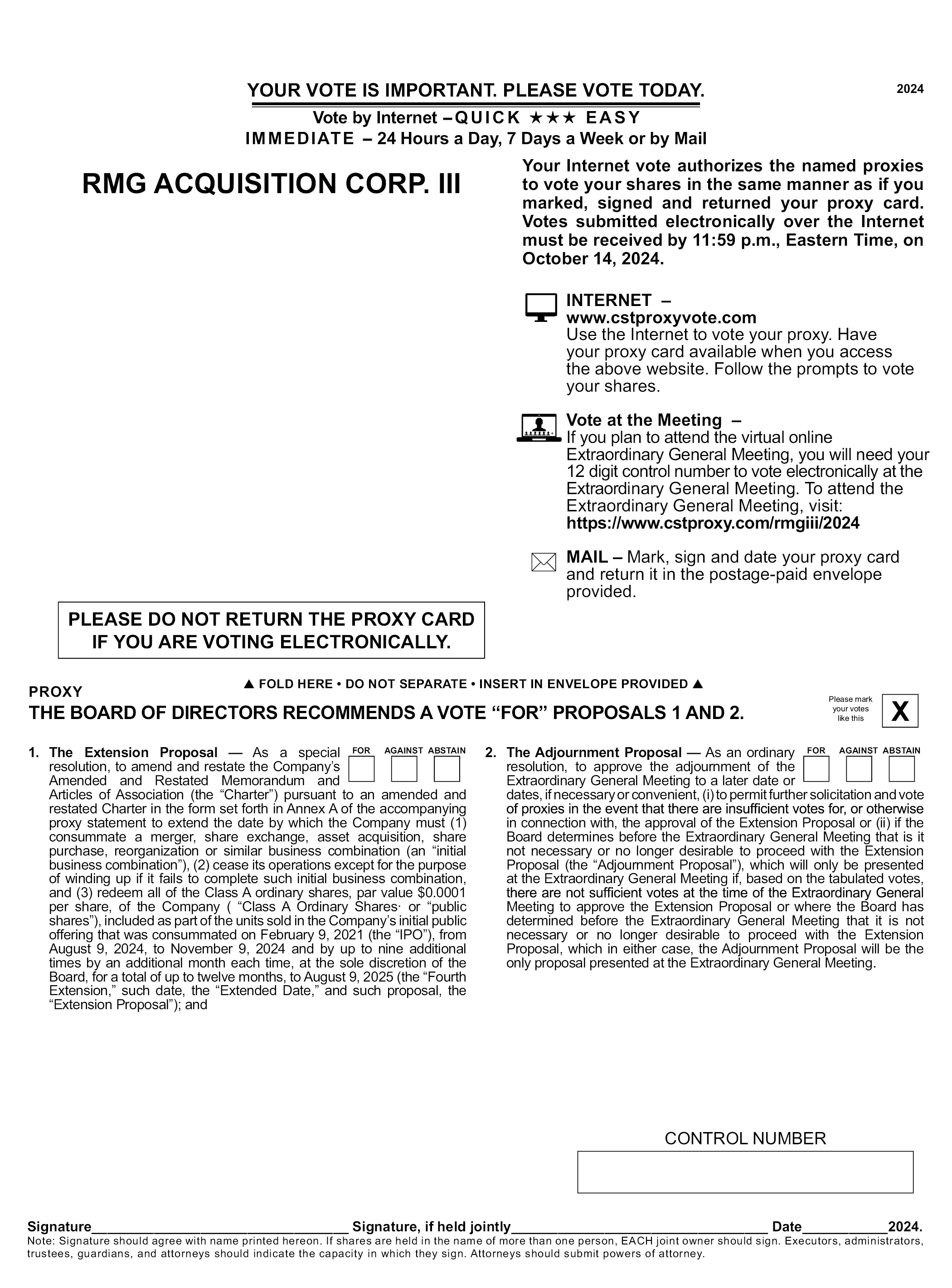 YOUR VOTE IS IMPORTANT. PLEASE VOTE TODAY. 2024 Vote by Internet - QUICK EASY IMMEDIATE - 24 Hours a Day, 7 Days a Week or by Mail RMG ACQUISITION CORP. III Your Internet vote authorizes the named proxies to vote your shares in the same manner as if you marked, signed and returned your proxy card. Votes submitted electronically over the Internet must be received by 11:59 p.m., Eastern Time, on October 14, 2024. INTERNET – www.cstproxyvote.com Use the Internet to vote your proxy. Have your proxy card available when you access the above website. Follow the prompts to vote your shares. Vote at the Meeting – If you plan to attend the virtual online Extraordinary General Meeting, you will need your 12 digit control number to vote electronically at the Extraordinary General Meeting. To attend the Extraordinary General Meeting, visit: https://www.cstproxy.com/rmgiii/2024 MAIL – Mark, sign and date your proxy card and return it in the postage-paid envelope provided. PLEASE DO NOT RETURN THE PROXY CARD IF YOU ARE VOTING ELECTRONICALLY. FOLD HERE • DO NOT SEPARATE • INSERT IN ENVELOPE PROVIDED PROXY THE BOARD OF DIRECTORS RECOMMENDS A VOTE “FOR” PROPOSALS 1 AND 2. Please mark your votes like this 1. The Extension Proposal — As a special resolution, to amend and restate the Company’s Amended and Restated Memorandum and Articles of Association (the “Charter”) pursuant to an amended and restated Charter in the form set forth in Annex A of the accompanying proxy statement to extend the date by which the Company must (1) consummate a merger, share exchange, asset acquisition, share purchase, reorganization or similar business combination (an “initial business combination”), (2) cease its operations except for the purpose of winding up if it fails to complete such initial business combination, and (3) redeem all of the Class A ordinary shares, par value $0.0001 per share, of the Company ( “Class A Ordinary Shares· or “public shares”), included as part of the units sold in the Company’s initial public offering that was consummated on February 9, 2021 (the “IPO”), from August 9, 2024, to November 9, 2024 and by up to nine additional times by an additional month each time, at the sole discretion of the Board, for a total of up to twelve months, to August 9, 2025 (the “Fourth Extension,” such date, the “Extended Date,” and such proposal, the “Extension Proposal”); and FOR AGAINST ABSTAIN 2. The Adjournment Proposal — As an ordinary resolution, to approve the adjournment of the Extraordinary General Meeting to a later date or dates, if necessary or convenient, (i) to permit further solicitation and vote of proxies in the event that there are insufficient votes for, or otherwise in connection with, the approval of the Extension Proposal or (ii) if the Board determines before the Extraordinary General Meeting that is it not necessary or no longer desirable to proceed with the Extension Proposal (the “Adjournment Proposal”), which will only be presented at the Extraordinary General Meeting if, based on the tabulated votes, there are not sufficient votes at the time of the Extraordinary General Meeting to approve the Extension Proposal or where the Board has determined before the Extraordinary General Meeting that it is not necessary or no longer desirable to proceed with the Extension Proposal, which in either case, the Adjournment Proposal will be the only proposal presented at the Extraordinary General Meeting. CONTROL NUMBER Signature Signature, if held jointly Date 2024. Note: Signature should agree with name printed hereon. If shares are held in the name of more than one person, EACH joint owner should sign. Executors, administrators, trustees, guardians, and attorneys should indicate the capacity in which they sign. Attorneys should submit powers of attorney.