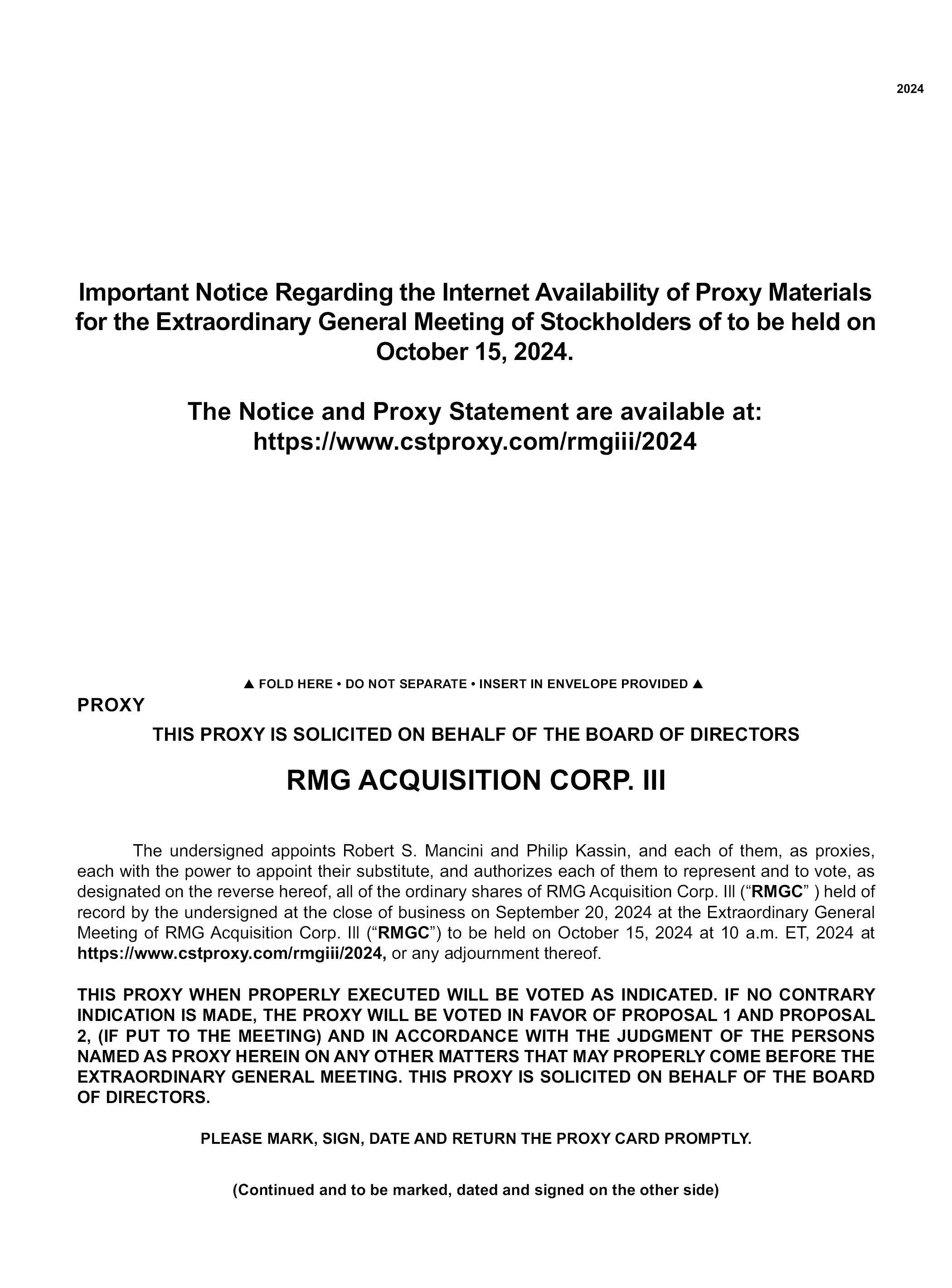 2024 mportant Notice Regarding the Internet Availability of Proxy Materials for the Extraordinary General Meeting of Stockholders of to be held on October 15, 2024. The Notice and Proxy Statement are available at: https://www.cstproxy.com/rmgiii/2024 FOLD HERE DO NOT SEPARATE INSERT IN ENVELOPE PROVIDED PROXY THIS PROXY IS SOLICITED ON BEHALF OF THE BOARD OF DIRECTORS RMG ACQUISITION CORP. III The undersigned appoints Robert S. Mancini and Philip Kassin, and each of them, as proxies, each with the power to appoint their substitute, and authorizes each of them to represent and to vote, as designated on the reverse hereof, all of the ordinary shares of RMG Acquisition Corp. Ill (“RMGC”) held of record by the undersigned at the close of business on September 20, 2024 at the Extraordinary General Meeting of RMG Acquisition Corp. Ill (“RMGC”) to be held on October 15, 2024 at 10 a.m. ET, 2024 at https://www.cstproxy.com/rmgiii/2024, or any adjournment thereof. THIS PROXY WHEN PROPERLY EXECUTED WILL BE VOTED AS INDICATED. IF NO CONTRARY INDICATION IS MADE, THE PROXY WILL BE VOTED IN FAVOR OF PROPOSAL 1 AND PROPOSAL 2, (IF PUT TO THE MEETING) AND IN ACCORDANCE WITH THE JUDGMENT OF THE PERSONS NAMED AS PROXY HEREIN ON ANY OTHER MATTERS THAT MAY PROPERLY COME BEFORE THE EXTRAORDINARY GENERAL MEETING. THIS PROXY IS SOLICITED ON BEHALF OF THE BOARD OF DIRECTORS. PLEASE MARK, SIGN, DATE AND RETURN THE PROXY CARD PROMPTLY. (Continued and to be marked, dated and signed on the other side)