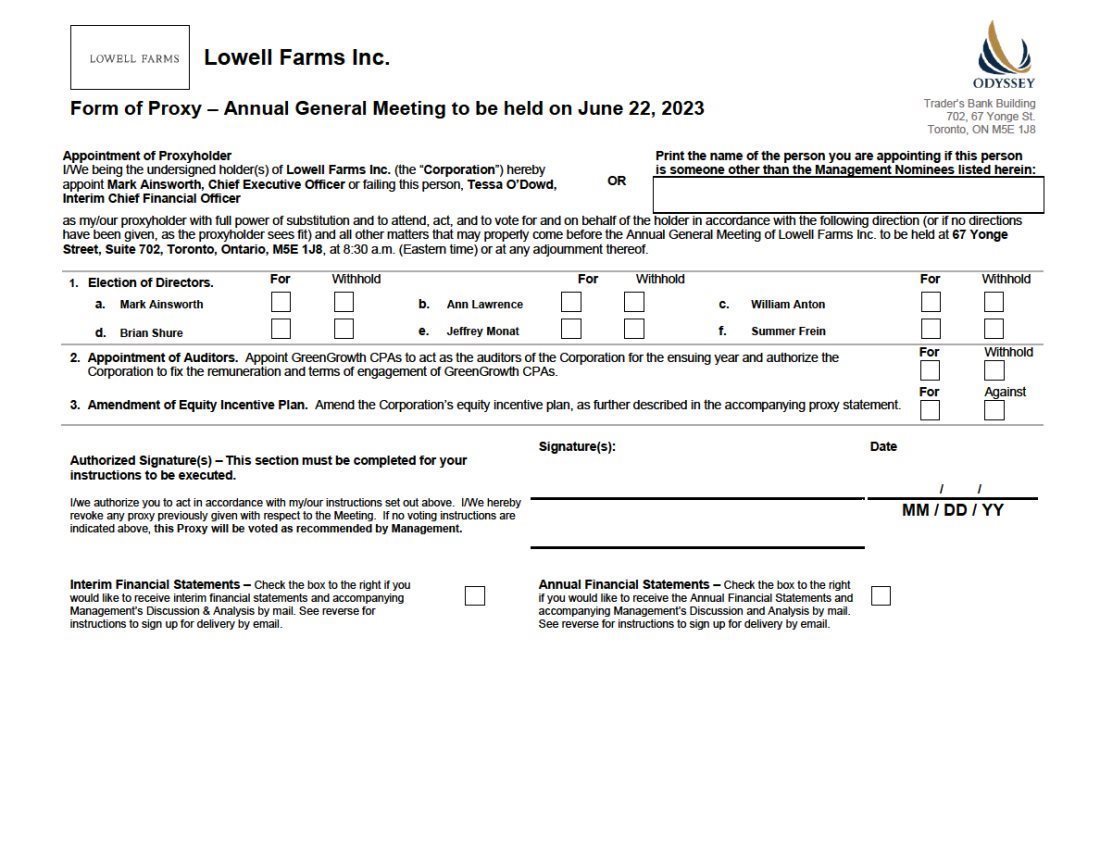 The 2023 annual general meeting of shareholders (the “Meeting”) of Lowell Farms Inc., a British Columbia corporation (the “Corporation” or the “Company”), will be held on June 22, 2023, beginning at 8:30 a.m. (Eastern Time), at Odyssey Trust Company, 67 Yonge St., Suite 702, Toronto, Ontario, M5E IJ8. This Notice of Meeting is accompanied by the proxy statement and form of proxy (“Proxy Instrument”).