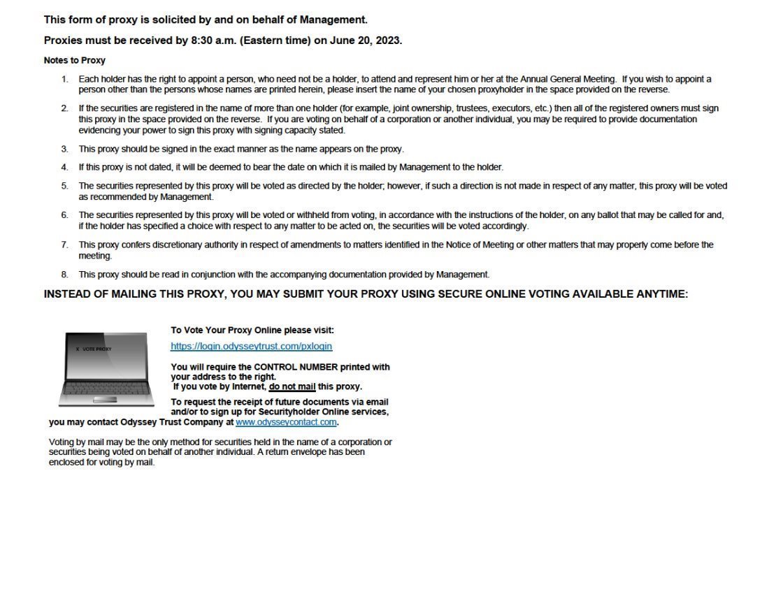 To be effective, the enclosed Proxy Instrument must be returned to the Corporation’s transfer agent by using the envelope provided or by mailing the Proxy Instrument to Odyssey Trust Company, 67 Yonge St., Suite 702, Toronto, Ontario, M5E 1J8 (Attention: Proxy Department). You may also vote on the Internet by going to https://login.odysseytrust.com/pxlogin, clicking on VOTE and following the instructions. You will need your control number located on the Proxy Instrument. If you wish to vote on the Internet, you must do so no later than June 20, 2023 at 8:30 a.m. (Eastern Time). If you vote prior to the Meeting using any other method, your Proxy Instrument must be received by Odyssey Trust Company no later than June 20, 2023 at 8:30 a.m. (Eastern Time). If the Meeting is adjourned, your proxy or voting instructions must be received at least 48 hours before the beginning of any adjournment(s) or postponement(s) of the Meeting.
