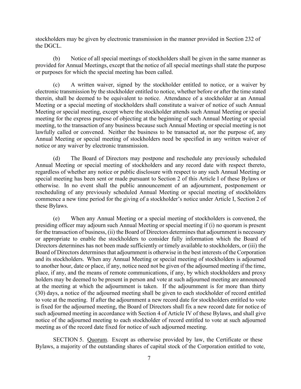 7 stockholders may be given by electronic transmission in the manner provided in Section 232 of the DGCL. (b) Notice of all special meetings of stockholders shall be given in the same manner as provided for Annual Meetings, except that the notice of all special meetings shall state the purpose or purposes for which the special meeting has been called. (c) A written waiver, signed by the stockholder entitled to notice, or a waiver by electronic transmission by the stockholder entitled to notice, whether before or after the time stated therein, shall be deemed to be equivalent to notice. Attendance of a stockholder at an Annual Meeting or a special meeting of stockholders shall constitute a waiver of notice of such Annual Meeting or special meeting, except where the stockholder attends such Annual Meeting or special meeting for the express purpose of objecting at the beginning of such Annual Meeting or special meeting, to the transaction of any business because such Annual Meeting or special meeting is not lawfully called or convened. Neither the business to be transacted at, nor the purpose of, any Annual Meeting or special meeting of stockholders need be specified in any written waiver of notice or any waiver by electronic transmission. (d) The Board of Directors may postpone and reschedule any previously scheduled Annual Meeting or special meeting of stockholders and any record date with respect thereto, regardless of whether any notice or public disclosure with respect to any such Annual Meeting or special meeting has been sent or made pursuant to Section 2 of this Article I of these Bylaws or otherwise. In no event shall the public announcement of an adjournment, postponement or rescheduling of any previously scheduled Annual Meeting or special meeting of stockholders commence a new time period for the giving of a stockholder’s notice under Article I, Section 2 of these Bylaws. (e) When any Annual Meeting or a special meeting of stockholders is convened, the presiding officer may adjourn such Annual Meeting or special meeting if (i) no quorum is present for the transaction of business, (ii) the Board of Directors determines that adjournment is necessary or appropriate to enable the stockholders to consider fully information which the Board of Directors determines has not been made sufficiently or timely available to stockholders, or (iii) the Board of Directors determines that adjournment is otherwise in the best interests of the Corporation and its stockholders. When any Annual Meeting or special meeting of stockholders is adjourned to another hour, date or place, if any, notice need not be given of the adjourned meeting if the time, place, if any, and the means of remote communications, if any, by which stockholders and proxy holders may be deemed to be present in person and vote at such adjourned meeting are announced at the meeting at which the adjournment is taken. If the adjournment is for more than thirty (30) days, a notice of the adjourned meeting shall be given to each stockholder of record entitled to vote at the meeting. If after the adjournment a new record date for stockholders entitled to vote is fixed for the adjourned meeting, the Board of Directors shall fix a new record date for notice of such adjourned meeting in accordance with Section 4 of Article IV of these Bylaws, and shall give notice of the adjourned meeting to each stockholder of record entitled to vote at such adjourned meeting as of the record date fixed for notice of such adjourned meeting. SECTION 5. Quorum. Except as otherwise provided by law, the Certificate or these Bylaws, a majority of the outstanding shares of capital stock of the Corporation entitled to vote,