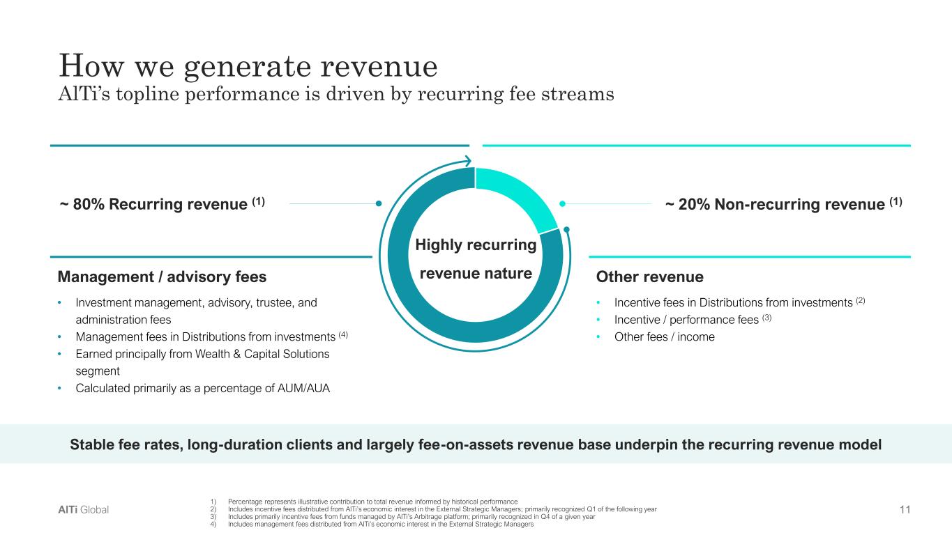 11AlTi Global How we generate revenue AlTi’s topline performance is driven by recurring fee streams ~ 80% Recurring revenue (1) ~ 20% Non-recurring revenue (1) Management / advisory fees • Investment management, advisory, trustee, and  administration fees • Management fees in Distributions from investments (4) • Earned principally from Wealth & Capital Solutions  segment • Calculated primarily as a percentage of AUM/AUA Other revenue  • Incentive fees in Distributions from investments (2) • Incentive / performance fees (3) • Other fees / income 1) Percentage represents illustrative contribution to total revenue informed by historical performance 2) Includes incentive fees distributed from AlTi’s economic interest in the External Strategic Managers; primarily recognized Q1 of the following year   3) Includes primarily incentive fees from funds managed by AlTi’s Arbitrage platform; primarily recognized in Q4 of a given year 4) Includes management fees distributed from AlTi’s economic interest in the External Strategic Managers Stable fee rates, long-duration clients and largely fee-on-assets revenue base underpin the recurring revenue model Highly recurring  revenue nature