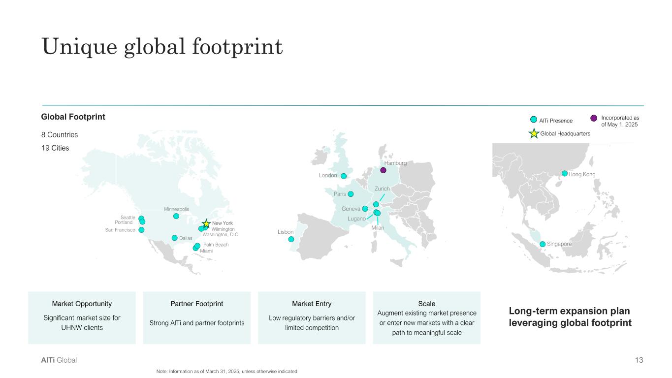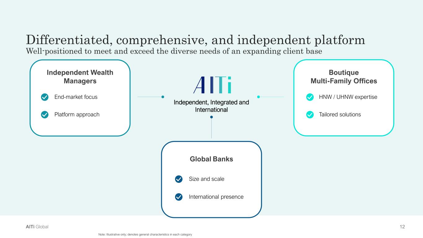 12AlTi Global Note: Illustrative only; denotes general characteristics in each category Differentiated, comprehensive, and independent platform Well-positioned to meet and exceed the diverse needs of an expanding client base Boutique  Multi-Family Offices Independent Wealth  Managers  End-market focus Platform approach HNW / UHNW expertise Tailored solutions Global Banks Size and scale International presence Independent, Integrated and International