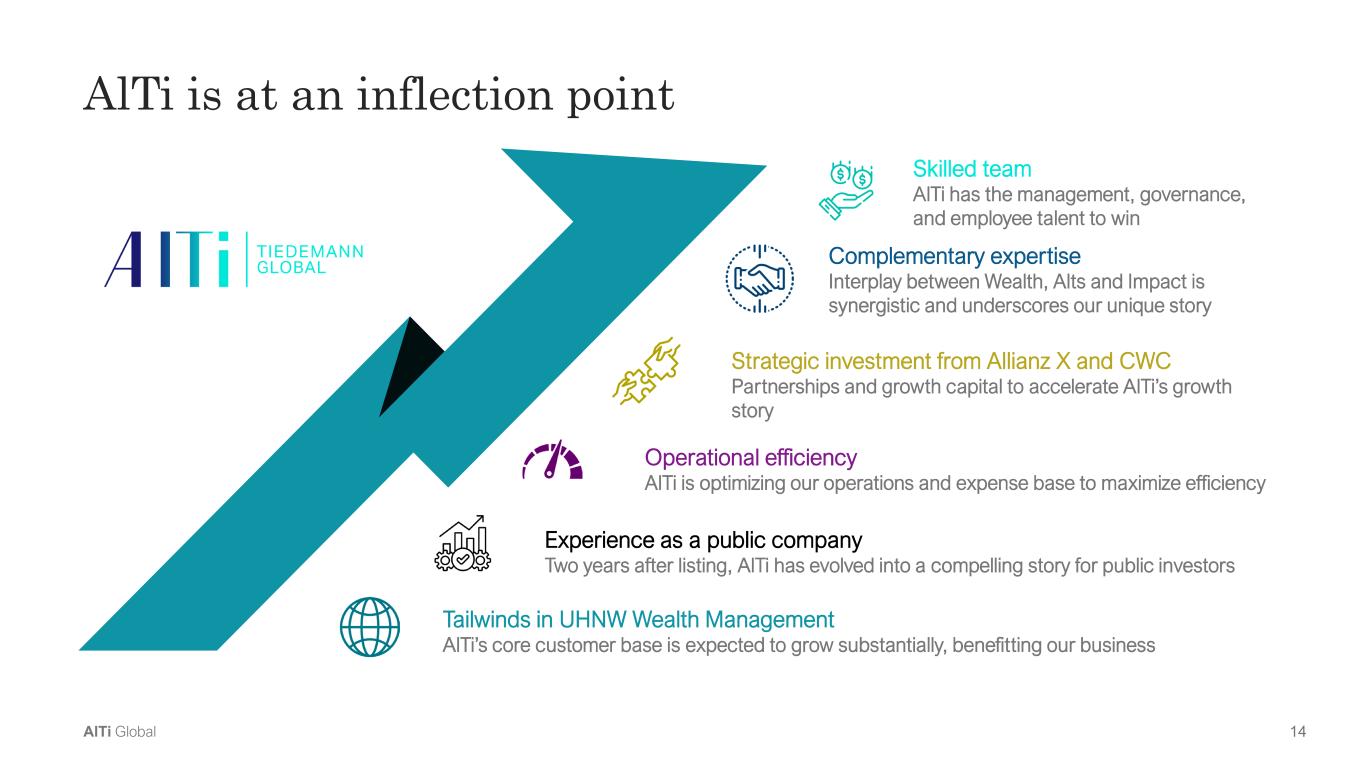 13AlTi Global Seattle Portland San Francisco Dallas Miami Minneapolis Washington, D.C. Palm Beach Wilmington New York Lisbon Lugano Geneva Zurich Milan London Paris Singapore Hong Kong Global Footprint Unique global footprint Long-term expansion plan  leveraging global footprint 8 Countries  19 Cities Market Opportunity  Significant market size for  UHNW clients Partner Footprint Strong AlTi and partner footprints Market Entry Low regulatory barriers and/or  limited competition Scale Augment existing market presence  or enter new markets with a clear  path to meaningful scale AlTi Presence Global Headquarters Note: Information as of March 31, 2025, unless otherwise indicated Hamburg Incorporated as  of May 1, 2025