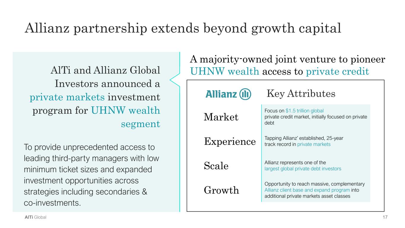 16AlTi Global U.S. & International Markets $2B to $20B AUM per Target in  UHNW Managers Profile • Proven low volatility, long-duration earnings • Bias towards management vs. performance/incentive fee income • Attractive top-line growth potential  • Proven high and sustainable margins  • Accretive to earnings Footprint/solutions • Enter new, complementary and strategic markets  • Grow market share in existing markets • Enhance solution set Fit • Ease of integration  • Cultural alignment  • Long-term, financially committed and incentivised management teams Pipeline and criteria for future acquisitions Allianz and CWC’s investment is already bearing fruit Notable acquisitions completed or announced 1) See Form 8-K filed on April 1, 2024, and other Company filings with the SEC 2) See Form 8-K filed on July 1, 2024, and other Company filings with the SEC 3) See Form 8-K filed on March 6, 2025, and other Company filings with the SEC • Minneapolis-based UHNW wealth manager with ~$3B AUM • Expands operations to the Midwest region of the U.S., fortifying  AlTi’s domestic footprint • Completed on July 1, 2024 (2) • New York-based independent advisory firm with ~$6B AUM • Enhances Outsourced Chief Investment Officer (OCIO) capabilities • Completed on April 3, 2024 (1) AlTi expects to use the                       and                       capital principally to fund accretive M&A • Hamburg-based UHNW wealth manager with ~$15B AUM/AUA • Expands European presence through entry into Germany, the third  largest UHNW market in the world  • Completed on April 30, 2025 (3)