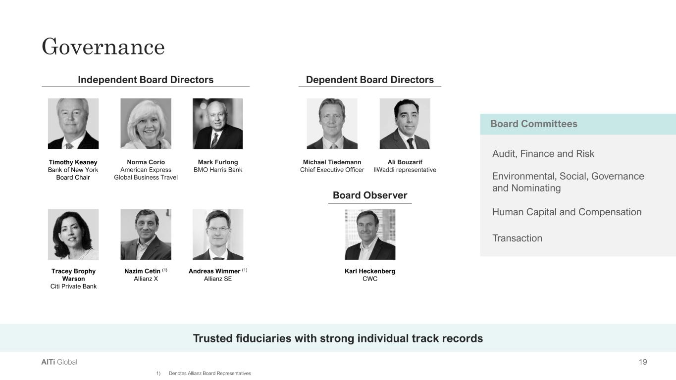 18AlTi Global Business Leads Broad, global industry experience Leadership  Michael Tiedemann Chief Executive Officer Kevin Moran President /  Chief Operating Officer Michael Harrington Chief Financial Officer Colleen Graham Chief Legal,  Compliance and  Risk Officer Claire Verdirame Chief Marketing Officer Executive Team US Europe  Nancy Curtin CIO – Global WM Brooke Connell President – US WM Craig Smith  Chair – Global WM Robert Weeber President –  International WM Patrick Flaton Real Estate Office Colin Peters Chief Human  Resources Officer Phillip Dundas Chief Technology Officer