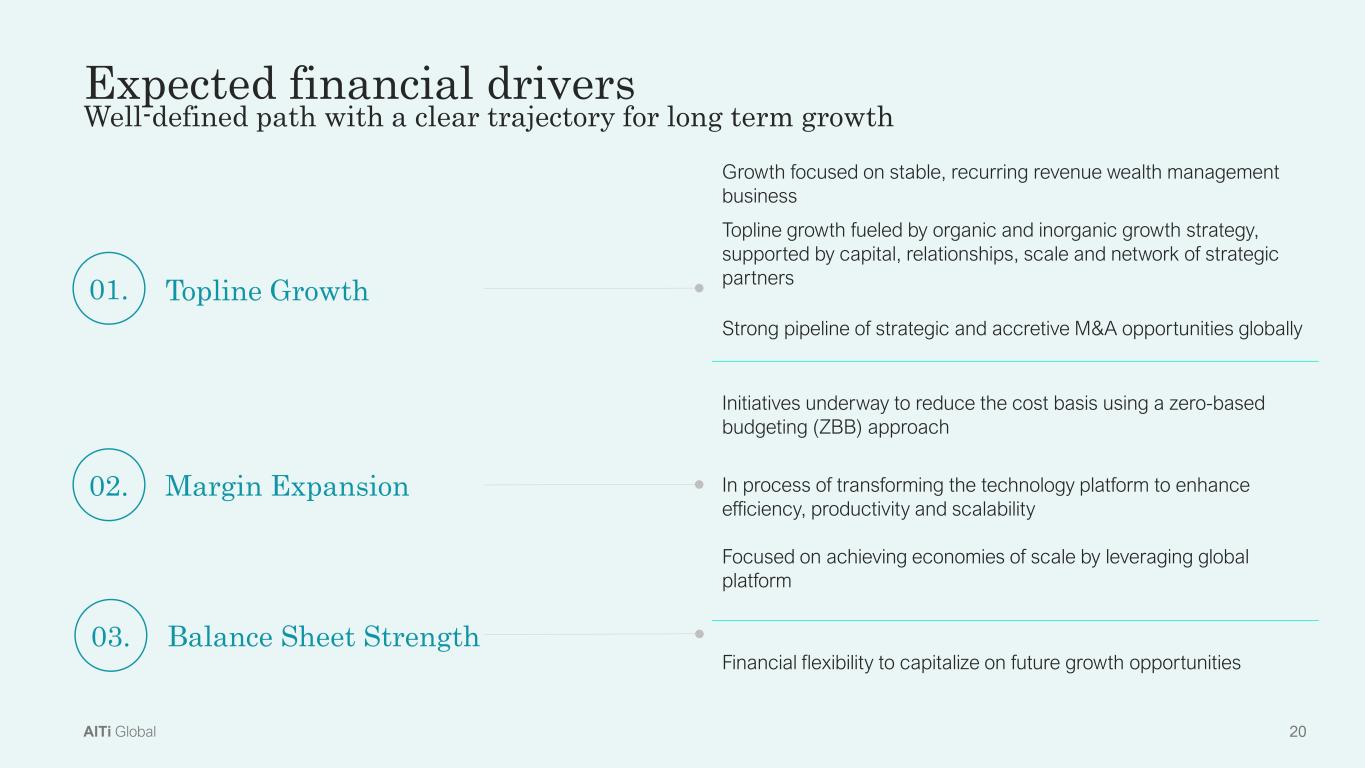 20AlTi Global Growth focused on stable, recurring revenue wealth management  business Topline growth fueled by organic and inorganic growth strategy,  supported by capital, relationships, scale and network of strategic  partners Strong pipeline of strategic and accretive M&A opportunities globally Initiatives underway to reduce the cost basis using a zero-based  budgeting (ZBB) approach   In process of transforming the technology platform to enhance  efficiency, productivity and scalability Focused on achieving economies of scale by leveraging global  platform Financial flexibility to capitalize on future growth opportunities 01. Topline Growth 02. Margin Expansion 03. Balance Sheet Strength Expected financial drivers Well-defined path with a clear trajectory for long term growth