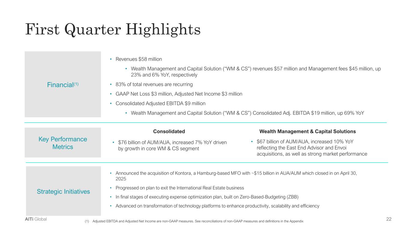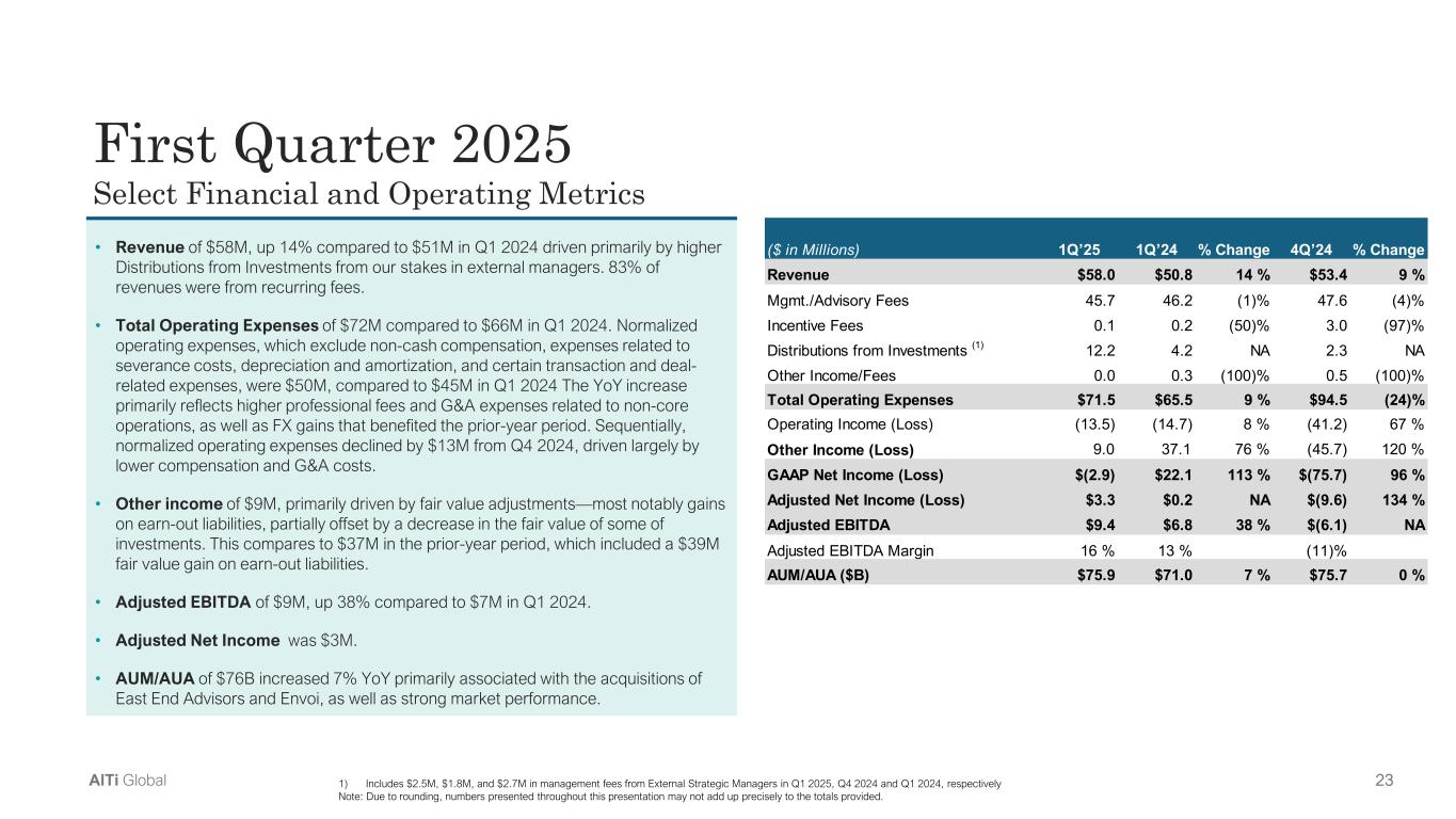 22AlTi Global Financial(1) Key Performance  Metrics • Revenues $58 million • Wealth Management and Capital Solution (“WM & CS”) revenues $57 million and Management fees $45 million, up  23% and 6% YoY, respectively  • 83% of total revenues are recurring • GAAP Net Loss $3 million, Adjusted Net Income $3 million • Consolidated Adjusted EBITDA $9 million • Wealth Management and Capital Solution (“WM & CS”) Consolidated Adj. EBITDA $19 million, up 69% YoY  First Quarter Highlights • $76 billion of AUM/AUA, increased 7% YoY driven  by growth in core WM & CS segment Consolidated Wealth Management & Capital Solutions (1) Adjusted EBITDA and Adjusted Net Income are non-GAAP measures. See reconciliations of non-GAAP measures and definitions in the Appendix • $67 billion of AUM/AUA, increased 10% YoY  reflecting the East End Advisor and Envoi  acquisitions, as well as strong market performance Strategic Initiatives • Announced the acquisition of Kontora, a Hamburg-based MFO with ~$15 billion in AUA/AUM which closed in on April 30,  2025 • Progressed on plan to exit the International Real Estate business  • In final stages of executing expense optimization plan, built on Zero-Based-Budgeting (ZBB) • Advanced on transformation of technology platforms to enhance productivity, scalability and efficiency