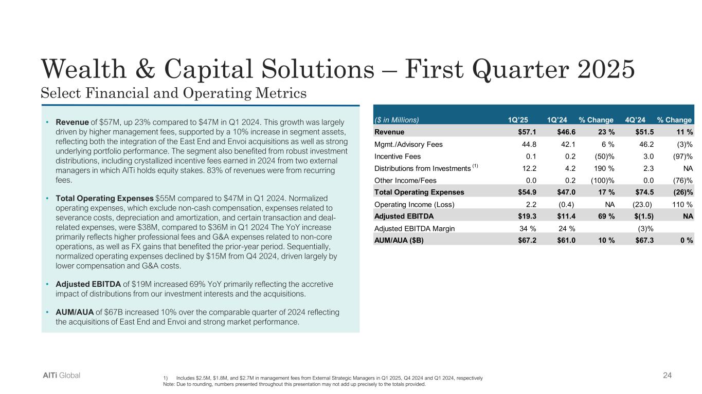 24AlTi Global • Revenue of $57M, up 23% compared to $47M in Q1 2024. This growth was largely  driven by higher management fees, supported by a 10% increase in segment assets,  reflecting both the integration of the East End and Envoi acquisitions as well as strong  underlying portfolio performance. The segment also benefited from robust investment  distributions, including crystallized incentive fees earned in 2024 from two external  managers in which AlTi holds equity stakes. 83% of revenues were from recurring  fees.  • Total Operating Expenses $55M compared to $47M in Q1 2024. Normalized  operating expenses, which exclude non-cash compensation, expenses related to  severance costs, depreciation and amortization, and certain transaction and deal- related expenses, were $38M, compared to $36M in Q1 2024 The YoY increase  primarily reflects higher professional fees and G&A expenses related to non-core  operations, as well as FX gains that benefited the prior-year period. Sequentially,  normalized operating expenses declined by $15M from Q4 2024, driven largely by  lower compensation and G&A costs.  • Adjusted EBITDA of $19M increased 69% YoY primarily reflecting the accretive  impact of distributions from our investment interests and the acquisitions.  • AUM/AUA of $67B increased 10% over the comparable quarter of 2024 reflecting  the acquisitions of East End and Envoi and strong market performance.  Wealth & Capital Solutions – First Quarter 2025 Select Financial and Operating Metrics 1) Includes $2.5M, $1.8M, and $2.7M in management fees from External Strategic Managers in Q1 2025, Q4 2024 and Q1 2024, respectively Note: Due to rounding, numbers presented throughout this presentation may not add up precisely to the totals provided. ($ in Millions) 1Q’25 1Q’24 % Change 4Q’24 % Change Revenue $57.1 $46.6 23 % $51.5 11 % Mgmt./Advisory Fees 44.8 42.1 6 % 46.2 (3)% Incentive Fees 0.1 0.2 (50)% 3.0 (97)% Distributions from Investments (1) 12.2 4.2 190 % 2.3  NA  Other Income/Fees 0.0 0.2 (100)% 0.0 (76)% Total Operating Expenses $54.9 $47.0 17 % $74.5 (26)% Operating Income (Loss)             2.2          (0.4)  NA        (23.0) 110 % Adjusted EBITDA $19.3 $11.4 69 % $(1.5)  NA  Adjusted EBITDA Margin 34 % 24 % (3)% AUM/AUA ($B) $67.2 $61.0 10 % $67.3 0 %
