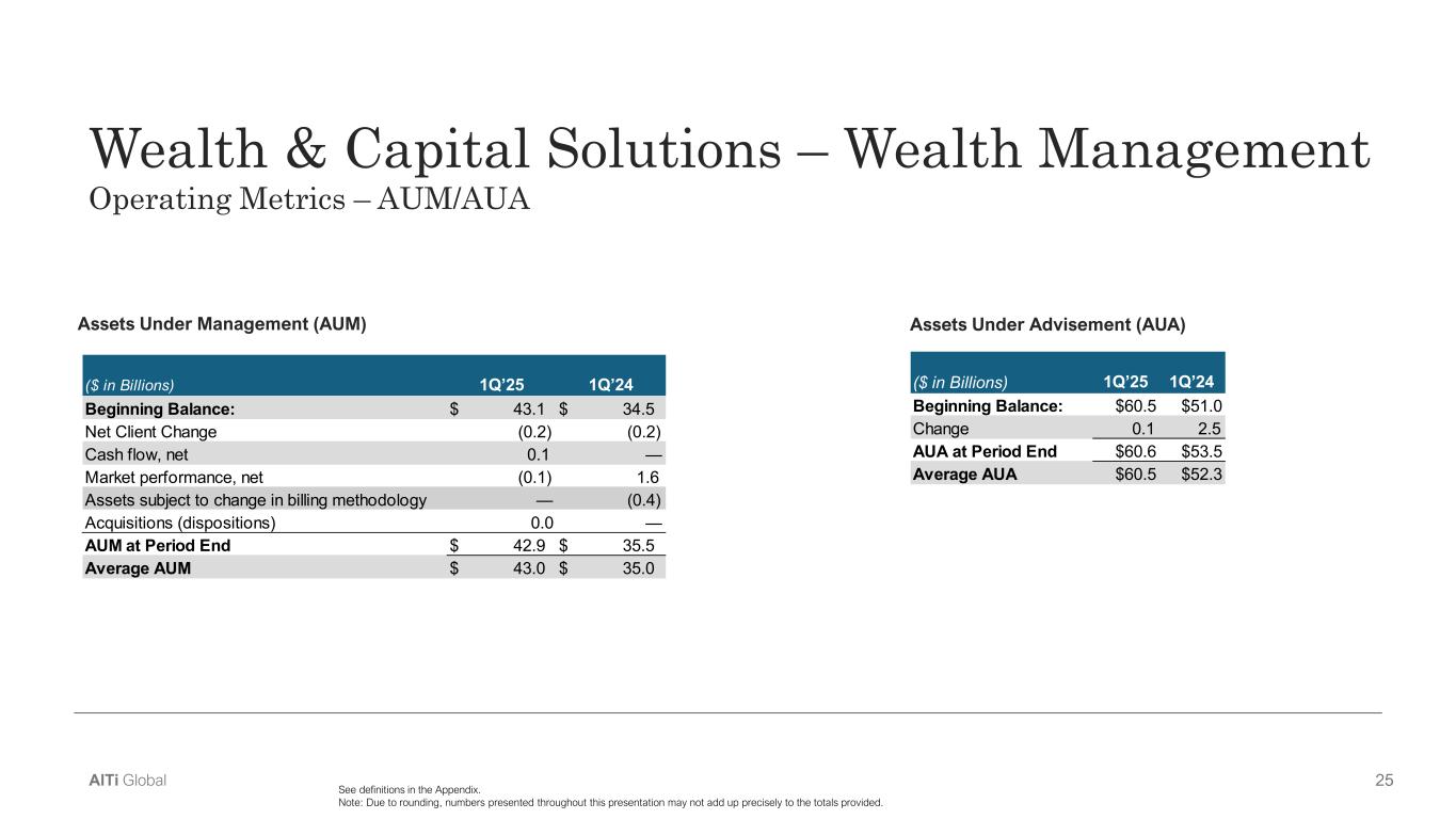 25AlTi Global Wealth & Capital Solutions – Wealth Management  Operating Metrics – AUM/AUA Assets Under Management (AUM) See definitions in the Appendix. Note: Due to rounding, numbers presented throughout this presentation may not add up precisely to the totals provided. Assets Under Advisement (AUA) ($ in Billions) 1Q’25 1Q’24 Beginning Balance: $60.5 $51.0 Change         0.1         2.5 AUA at Period End $60.6 $53.5 Average AUA $60.5 $52.3 ($ in Billions) 1Q’25 1Q’24 Beginning Balance: $            43.1 $            34.5  Net Client Change                (0.2)                (0.2) Cash flow, net                  0.1                    — Market performance, net                (0.1)                  1.6 Assets subject to change in billing methodology                    —                (0.4) Acquisitions (dispositions) 0.0                    — AUM at Period End $            42.9 $            35.5  Average AUM $            43.0 $            35.0
