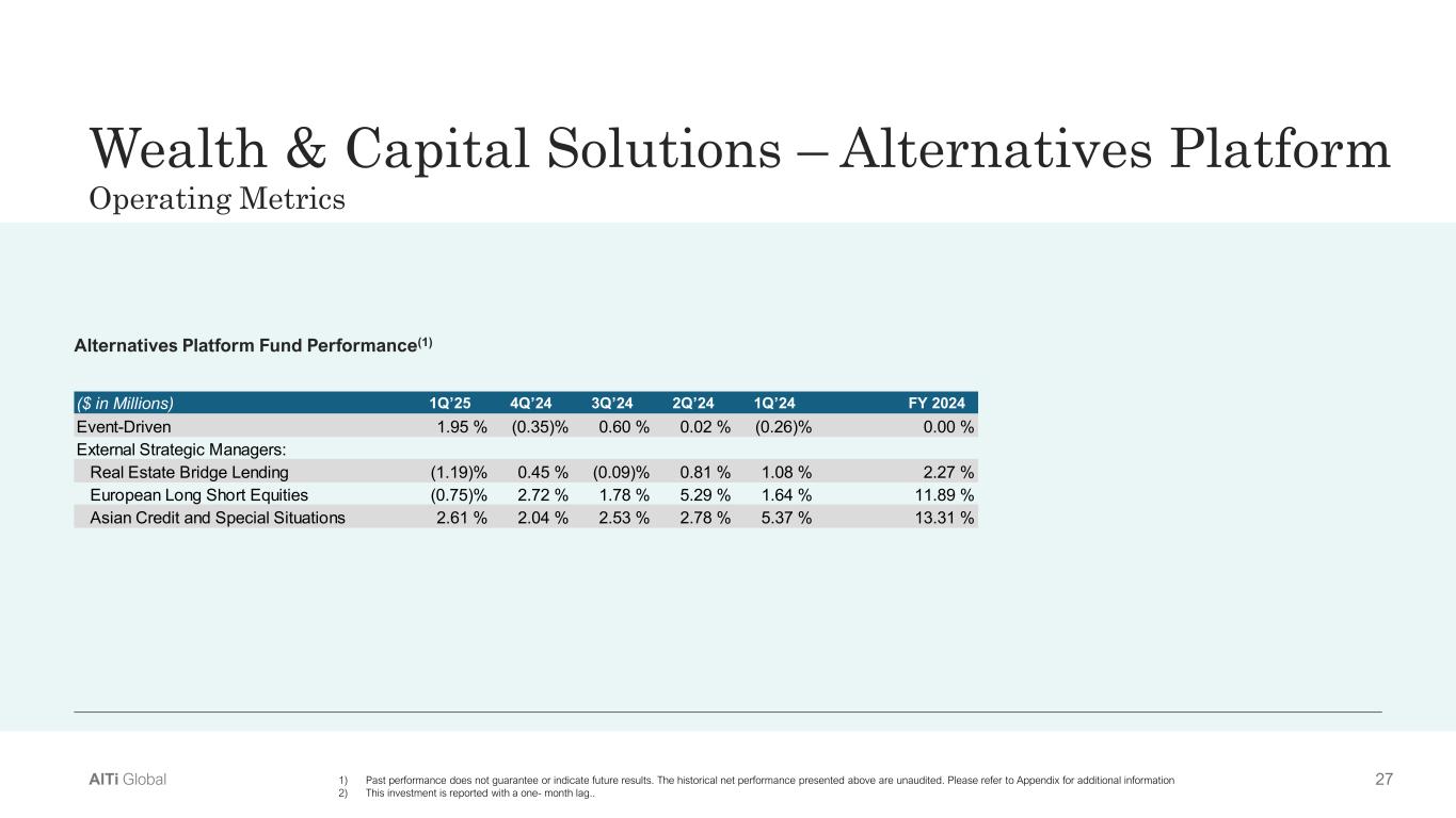 26AlTi Global Wealth & Capital Solutions – Alternatives Platform  Operating Metrics – AUM/AUA Alternatives Platform See definitions in the Appendix. 1) The fair value of this investment is reported on a one-month lag. ($ in Millions) January 1, 2025 Gross  Appreciation Subscriptions Redemptions Distributions March 31, 2025 Average  AUM/AUA Event-Driven $1,719 $45 $46 $(218) $(4) $1,588 $1,654  External Strategic Managers: Real Estate Bridge Lending (1) 2,019 (90) 0 0 (7) 1,922 1,971 European Long Short Equities 1,848 4 69 (13) (6) 1,902 1,875 Asian Credit and Special Situations 1,260 40 4 (123) (8) 1,173 1,217 External Strategic Managers 5,127 (46) 73 (136) (21) 4,997 5,063 Total AUM/AUA $6,846 $(1) $119 $(354) $(25) $6,585 $6,717  ($ in Millions) January 1, 2024 Gross  Appreciation Subscriptions Redemptions Distributions March 31, 2024 Average  AUM/AUA Event-Driven $2,382 $(5) $83 $(201) $(6) $2,253 $2,318  External Strategic Managers: Real Estate Bridge Lending (1) 2,194 (57) 0 0 6 2,143 2,169 European Long Short Equities 1,676 26 14 (26) (6) 1,684 1,680 Asian Credit and Special Situations 1,388 90 15 (57) (17) 1,419 1,404 External Strategic Managers 5,258 59 29 (83) (17) 5,246 5,253 Total AUM/AUA $7,640 $54 $112 $(284) $(23) $7,499 $7,571