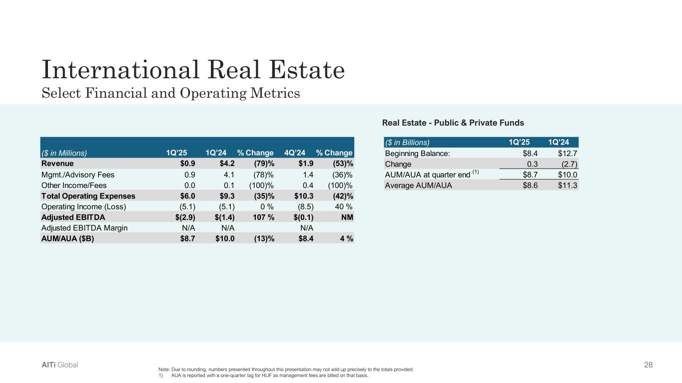 28AlTi Global International Real Estate Select Financial and Operating Metrics Real Estate - Public & Private Funds Note: Due to rounding, numbers presented throughout this presentation may not add up precisely to the totals provided. 1) AUA is reported with a one-quarter lag for HLIF as management fees are billed on that basis. ($ in Billions) 1Q’25 1Q’24 Beginning Balance: $8.4 $12.7 Change 0.3 (2.7) AUM/AUA at quarter end (1) $8.7 $10.0 Average AUM/AUA $8.6 $11.3 ($ in Millions) 1Q’25 1Q’24 % Change 4Q’24 % Change Revenue $0.9 $4.2 (79)% $1.9 (53)% Mgmt./Advisory Fees 0.9 4.1 (78)% 1.4 (36)% Other Income/Fees 0.0 0.1 (100)% 0.4 (100)% Total Operating Expenses $6.0 $9.3 (35)% $10.3 (42)% Operating Income (Loss)           (5.1)           (5.1) 0 %           (8.5) 40 % Adjusted EBITDA $(2.9) $(1.4) 107 % $(0.1)  NM  Adjusted EBITDA Margin N/A N/A N/A AUM/AUA ($B) $8.7 $10.0 (13)% $8.4 4 %