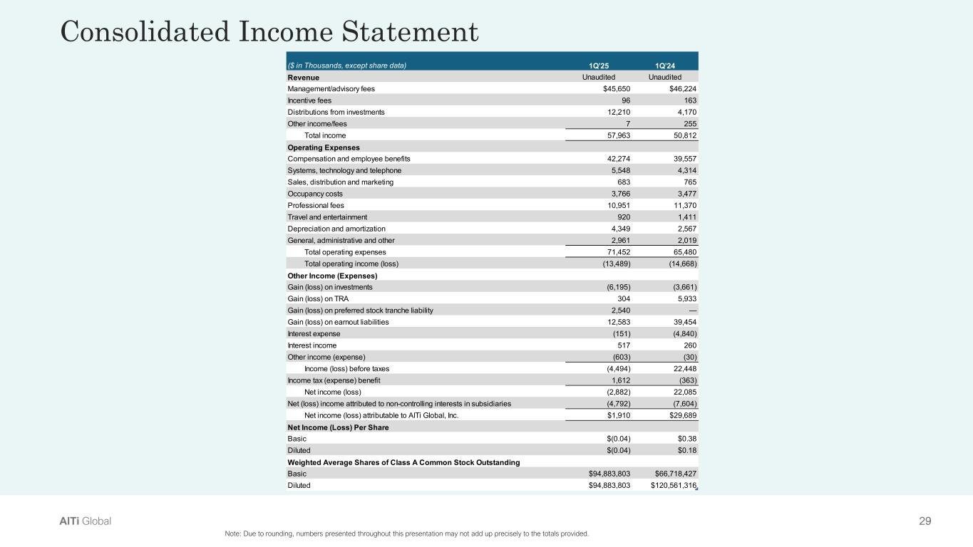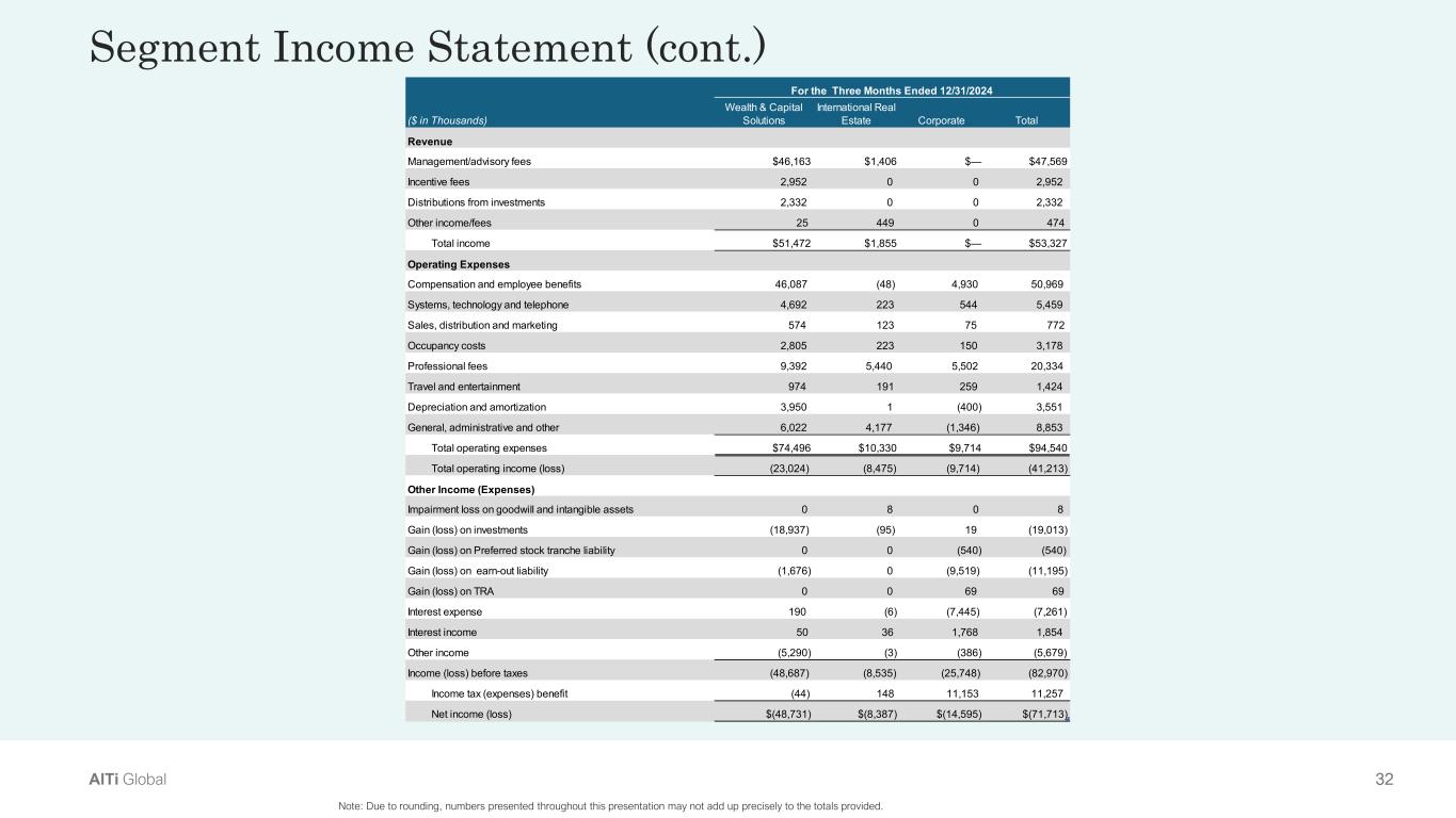32AlTi Global Segment Income Statement (cont.)  Note: Due to rounding, numbers presented throughout this presentation may not add up precisely to the totals provided. ($ in Thousands) Wealth & Capital  Solutions International Real  Estate Corporate Total Revenue                                                                   Management/advisory fees $46,163 $1,406 $— $47,569  Incentive fees                         2,952                            0                            0                    2,952  Distributions from investments                         2,332                            0                            0                    2,332  Other income/fees                               25                        449                            0                        474  Total income $51,472 $1,855 $— $53,327  Operating Expenses Compensation and employee benefits                       46,087                        (48)                    4,930                  50,969  Systems, technology and telephone                         4,692                        223                       544                    5,459  Sales, distribution and marketing                            574                        123                         75                        772  Occupancy costs                         2,805                        223                       150                    3,178  Professional fees                         9,392                    5,440                    5,502                  20,334  Travel and entertainment                            974                        191                       259                    1,424  Depreciation and amortization                         3,950                            1                      (400)                    3,551  General, administrative and other                         6,022                    4,177                  (1,346)                    8,853  Total operating expenses $74,496 $10,330 $9,714 $94,540  Total operating income (loss)                     (23,024)                   (8,475)                  (9,714)                 (41,213) Other Income (Expenses) Impairment loss on goodwill and intangible assets                                 0                            8                            0                            8  Gain (loss) on investments                     (18,937)                        (95)                         19                 (19,013) Gain (loss) on Preferred stock tranche liability                                 0                            0                      (540)                      (540) Gain (loss) on  earn-out liability                        (1,676)                            0                  (9,519)                 (11,195) Gain (loss) on TRA                                 0                            0                         69                          69  Interest expense                            190                           (6)                  (7,445)                   (7,261) Interest income                               50                          36                    1,768                    1,854  Other income                        (5,290)                           (3)                      (386)                   (5,679) Income (loss) before taxes                     (48,687)                   (8,535)                (25,748)                 (82,970) Income tax (expenses) benefit                             (44)                        148                  11,153                  11,257  Net income (loss) $(48,731) $(8,387) $(14,595) $(71,713) For the  Three Months Ended 12/31/2024