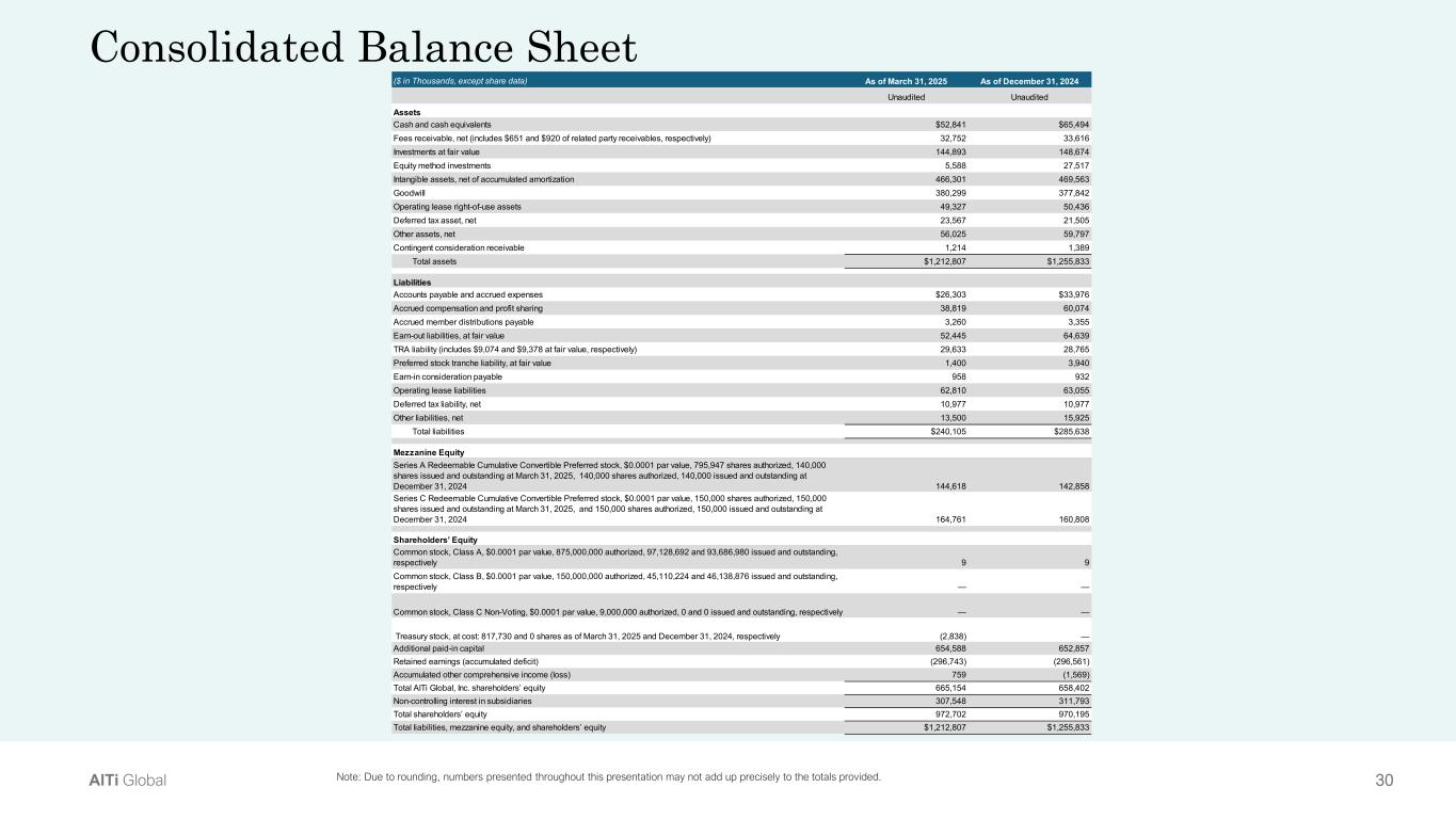 29AlTi Global Consolidated Income Statement Note: Due to rounding, numbers presented throughout this presentation may not add up precisely to the totals provided. ($ in Thousands, except share data) 1Q’25 1Q’24 Revenue Unaudited Unaudited Management/advisory fees $45,650 $46,224 Incentive fees 96 163 Distributions from investments 12,210 4,170 Other income/fees 7 255 Total income 57,963 50,812 Operating Expenses Compensation and employee benefits 42,274 39,557 Systems, technology and telephone 5,548 4,314 Sales, distribution and marketing 683 765 Occupancy costs 3,766 3,477 Professional fees 10,951 11,370 Travel and entertainment 920 1,411 Depreciation and amortization 4,349 2,567 General, administrative and other 2,961 2,019 Total operating expenses 71,452 65,480 Total operating income (loss) (13,489) (14,668) Other Income (Expenses) Gain (loss) on investments (6,195) (3,661) Gain (loss) on TRA 304 5,933 Gain (loss) on preferred stock tranche liability 2,540 — Gain (loss) on earnout liabilities 12,583 39,454 Interest expense (151) (4,840) Interest income 517 260 Other income (expense) (603) (30) Income (loss) before taxes (4,494) 22,448 Income tax (expense) benefit 1,612 (363) Net income (loss) (2,882) 22,085 Net (loss) income attributed to non-controlling interests in subsidiaries (4,792) (7,604) Net income (loss) attributable to AlTi Global, Inc. $1,910 $29,689  Net Income (Loss) Per Share Basic $(0.04) $0.38  Diluted $(0.04) $0.18  Weighted Average Shares of Class A Common Stock Outstanding Basic $94,883,803 $66,718,427 Diluted $94,883,803 $120,561,316