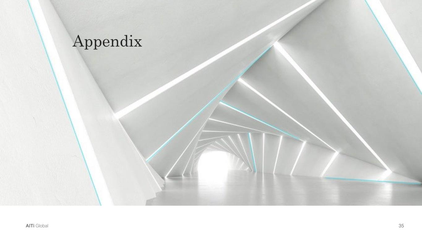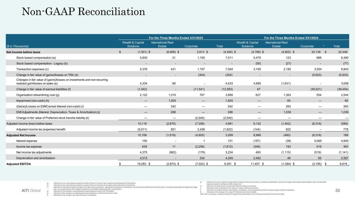 34AlTi Global Non-GAAP Reconciliation (cont.) ($ in Thousands) Wealth & Capital  Solutions International Real  Estate Corporate Total Net income before taxes $                     (48,333) $                      (8,460) $                    (30,150) $                   (86,943) Stock based compensation (a)                             5,934                             (200)                               855                           6,589 Stock based compensation - Legacy (b)                                     -                                     -                                     -                                   - Transaction expenses (c)                          14,346                               350                            2,551                        17,247 Change in fair value of (gains)/losses on TRA (d)                                     -                                     -                               (69)                              (69) Changes in fair value of (gains)/losses on investments and non-recurring  realized gain/losses on sales (e)                          19,430                               882                                     -                        20,312 Change in fair value of earnout liabilities (f)                             1,676                                     -                            9,519                        11,195 Organization streamlining cost (g)                                984                            6,920                            1,238                           9,142 Impairment (non-cash) (h)                                696                                    3                                  —                              699 (Gains)/Losses on EMI/Carried Interest (non-cash) (i)                                  (3)                               242                                  —                              239 EMI Adjustments (Interest, Depreciation, Taxes & Amortization) (j)                                  11                               132                                  —                              143 Change in fair value of Preferred stock tranche liability (k)                                   —                                  —                               540                              540 Adjusted income (loss) before taxes                          (5,259)                             (131)                       (15,516)                      (20,906) Adjusted income tax (expense) benefit                          (2,095)                            1,002                            8,409                           7,316 Adjusted Net Income                          (7,354)                               871                         (7,107)                      (13,590) Interest expense                             (190)                                    6                            7,445                           7,261 Income tax expense                                  44                             (148)                       (11,153)                      (11,257) Net income tax adjustments                             2,051                             (854)                            2,744                           3,941 Depreciation and amortization                             3,951                                    1                             (401)                           3,551 Adjusted EBITDA $                       (1,498) $                         (124) $                      (8,472) $                   (10,094) For the Three Months Ended 12/31/2024 g) Add-back of cost to implement organization change to derive cost synergy, including consulting fees, severance charges, technology implementation costs, and bad debt  expense related to strategic portfolio realignment. h) Add-back of impairment of carried interest/equity method investments. i) Add-back of the amortization of the step-up in equity method investments. j) Add-back of reported interest, depreciation, amortization, and tax adjustments of the Company's equity method investments. k) Add-back of the change in fair value of Preferred stock tranche liability. Note: Due to rounding, numbers presented throughout this presentation may not add up precisely to the totals provided. a) Add-back of non-cash expense related to awards of Class A Common stock (approved post-Business Combination). b) Add-back of non-cash expense related to awards of Class A Common stock (approved pre-Business Combination). c) Add-back of transaction expenses related to the Business Combination, subsequent acquisitions or divestitures, and issuance of preferred and common stock, including compensation arrangements, legal  fees, accounting advisory fees, litigation settlements, and M&A-related audit fees, among others.  d) Add-back of the change in unrealized gains/losses related primarily to the TRA liability. e) Add-back of the change in unrealized gains/losses related to Investments held at fair value. f) Add-back to the change in fair value of the earn-out liabilities.