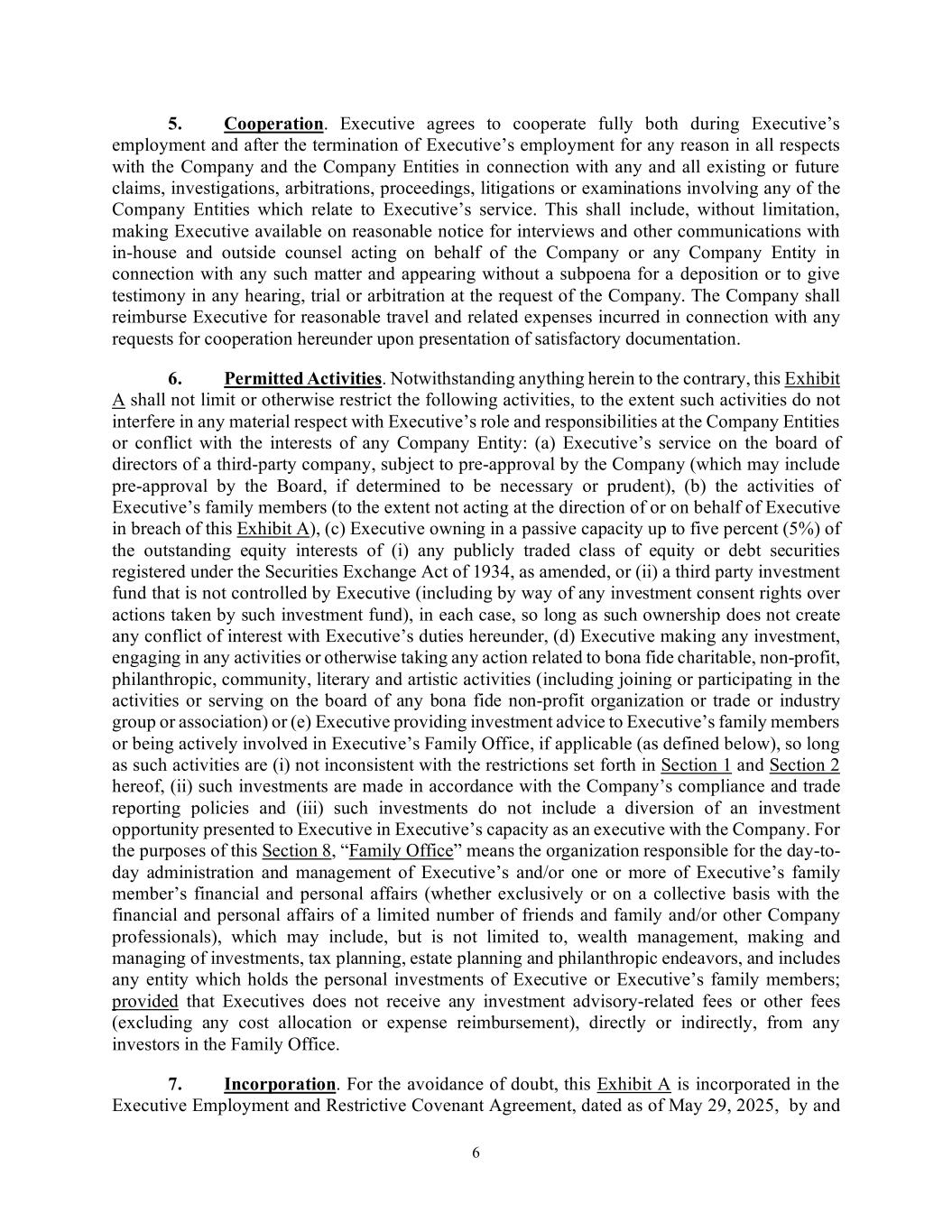 6 5. Cooperation. Executive agrees to cooperate fully both during Executive’s employment and after the termination of Executive’s employment for any reason in all respects with the Company and the Company Entities in connection with any and all existing or future claims, investigations, arbitrations, proceedings, litigations or examinations involving any of the Company Entities which relate to Executive’s service. This shall include, without limitation, making Executive available on reasonable notice for interviews and other communications with in-house and outside counsel acting on behalf of the Company or any Company Entity in connection with any such matter and appearing without a subpoena for a deposition or to give testimony in any hearing, trial or arbitration at the request of the Company. The Company shall reimburse Executive for reasonable travel and related expenses incurred in connection with any requests for cooperation hereunder upon presentation of satisfactory documentation. 6. Permitted Activities. Notwithstanding anything herein to the contrary, this Exhibit A shall not limit or otherwise restrict the following activities, to the extent such activities do not interfere in any material respect with Executive’s role and responsibilities at the Company Entities or conflict with the interests of any Company Entity: (a) Executive’s service on the board of directors of a third-party company, subject to pre-approval by the Company (which may include pre-approval by the Board, if determined to be necessary or prudent), (b) the activities of Executive’s family members (to the extent not acting at the direction of or on behalf of Executive in breach of this Exhibit A), (c) Executive owning in a passive capacity up to five percent (5%) of the outstanding equity interests of (i) any publicly traded class of equity or debt securities registered under the Securities Exchange Act of 1934, as amended, or (ii) a third party investment fund that is not controlled by Executive (including by way of any investment consent rights over actions taken by such investment fund), in each case, so long as such ownership does not create any conflict of interest with Executive’s duties hereunder, (d) Executive making any investment, engaging in any activities or otherwise taking any action related to bona fide charitable, non-profit, philanthropic, community, literary and artistic activities (including joining or participating in the activities or serving on the board of any bona fide non-profit organization or trade or industry group or association) or (e) Executive providing investment advice to Executive’s family members or being actively involved in Executive’s Family Office, if applicable (as defined below), so long as such activities are (i) not inconsistent with the restrictions set forth in Section 1 and Section 2 hereof, (ii) such investments are made in accordance with the Company’s compliance and trade reporting policies and (iii) such investments do not include a diversion of an investment opportunity presented to Executive in Executive’s capacity as an executive with the Company. For the purposes of this Section 8, “Family Office” means the organization responsible for the day-to- day administration and management of Executive’s and/or one or more of Executive’s family member’s financial and personal affairs (whether exclusively or on a collective basis with the financial and personal affairs of a limited number of friends and family and/or other Company professionals), which may include, but is not limited to, wealth management, making and managing of investments, tax planning, estate planning and philanthropic endeavors, and includes any entity which holds the personal investments of Executive or Executive’s family members; provided that Executives does not receive any investment advisory-related fees or other fees (excluding any cost allocation or expense reimbursement), directly or indirectly, from any investors in the Family Office. 7. Incorporation. For the avoidance of doubt, this Exhibit A is incorporated in the Executive Employment and Restrictive Covenant Agreement, dated as of May 29, 2025, by and