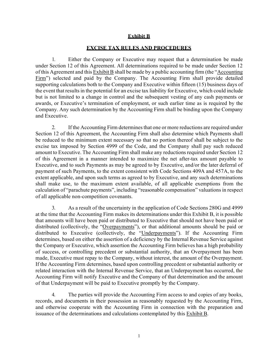 1 Exhibit B EXCISE TAX RULES AND PROCEDURES 1. Either the Company or Executive may request that a determination be made under Section 12 of this Agreement. All determinations required to be made under Section 12 of this Agreement and this Exhibit B shall be made by a public accounting firm (the “Accounting Firm”) selected and paid by the Company. The Accounting Firm shall provide detailed supporting calculations both to the Company and Executive within fifteen (15) business days of the event that results in the potential for an excise tax liability for Executive, which could include but is not limited to a change in control and the subsequent vesting of any cash payments or awards, or Executive’s termination of employment, or such earlier time as is required by the Company. Any such determination by the Accounting Firm shall be binding upon the Company and Executive. 2. If the Accounting Firm determines that one or more reductions are required under Section 12 of this Agreement, the Accounting Firm shall also determine which Payments shall be reduced to the minimum extent necessary so that no portion thereof shall be subject to the excise tax imposed by Section 4999 of the Code, and the Company shall pay such reduced amount to Executive. The Accounting Firm shall make any reductions required under Section 12 of this Agreement in a manner intended to maximize the net after-tax amount payable to Executive, and to such Payments as may be agreed to by Executive, and/or the later deferral of payment of such Payments, to the extent consistent with Code Sections 409A and 457A, to the extent applicable, and upon such terms as agreed to by Executive, and any such determinations shall make use, to the maximum extent available, of all applicable exemptions from the calculation of “parachute payments”, including “reasonable compensation” valuations in respect of all applicable non-competition covenants. 3. As a result of the uncertainty in the application of Code Sections 280G and 4999 at the time that the Accounting Firm makes its determinations under this Exhibit B, it is possible that amounts will have been paid or distributed to Executive that should not have been paid or distributed (collectively, the “Overpayments”), or that additional amounts should be paid or distributed to Executive (collectively, the “Underpayments”). If the Accounting Firm determines, based on either the assertion of a deficiency by the Internal Revenue Service against the Company or Executive, which assertion the Accounting Firm believes has a high probability of success, or controlling precedent or substantial authority, that an Overpayment has been made, Executive must repay to the Company, without interest, the amount of the Overpayment. If the Accounting Firm determines, based upon controlling precedent or substantial authority or related interaction with the Internal Revenue Service, that an Underpayment has occurred, the Accounting Firm will notify Executive and the Company of that determination and the amount of that Underpayment will be paid to Executive promptly by the Company. 4. The parties will provide the Accounting Firm access to and copies of any books, records, and documents in their possession as reasonably requested by the Accounting Firm, and otherwise cooperate with the Accounting Firm in connection with the preparation and issuance of the determinations and calculations contemplated by this Exhibit B.