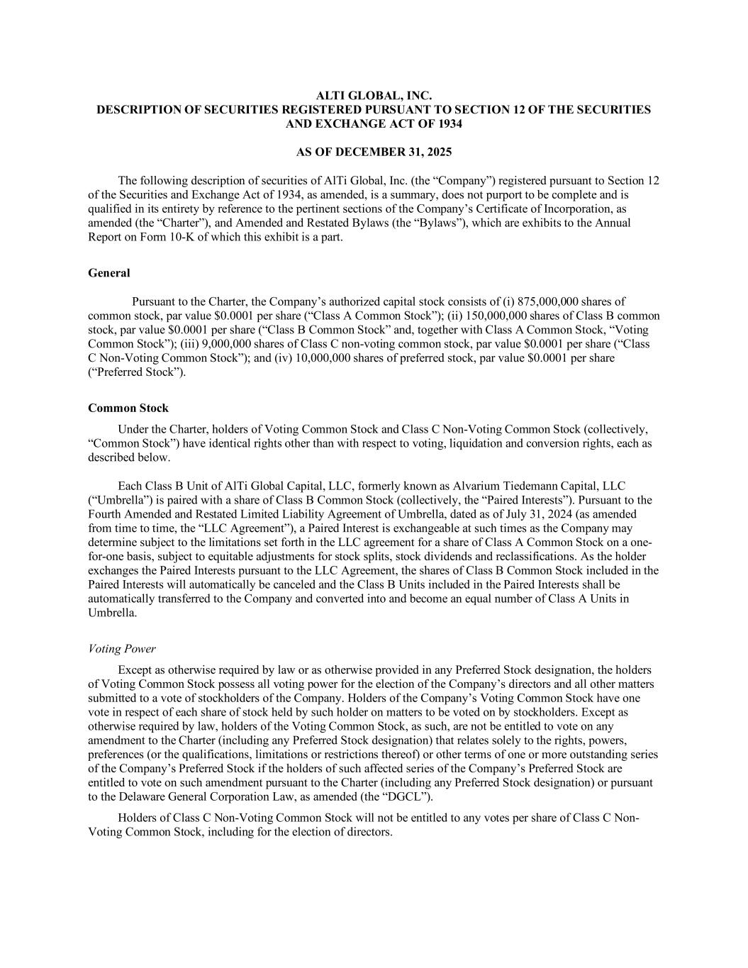 ALTI GLOBAL, INC. DESCRIPTION OF SECURITIES REGISTERED PURSUANT TO SECTION 12 OF THE SECURITIES AND EXCHANGE ACT OF 1934 AS OF DECEMBER 31, 2025 The following description of securities of AlTi Global, Inc. (the “Company”) registered pursuant to Section 12 of the Securities and Exchange Act of 1934, as amended, is a summary, does not purport to be complete and is qualified in its entirety by reference to the pertinent sections of the Company’s Certificate of Incorporation, as amended (the “Charter”), and Amended and Restated Bylaws (the “Bylaws”), which are exhibits to the Annual Report on Form 10-K of which this exhibit is a part. General Pursuant to the Charter, the Company’s authorized capital stock consists of (i) 875,000,000 shares of common stock, par value $0.0001 per share (“Class A Common Stock”); (ii) 150,000,000 shares of Class B common stock, par value $0.0001 per share (“Class B Common Stock” and, together with Class A Common Stock, “Voting Common Stock”); (iii) 9,000,000 shares of Class C non-voting common stock, par value $0.0001 per share (“Class C Non-Voting Common Stock”); and (iv) 10,000,000 shares of preferred stock, par value $0.0001 per share (“Preferred Stock”). Common Stock Under the Charter, holders of Voting Common Stock and Class C Non-Voting Common Stock (collectively, “Common Stock”) have identical rights other than with respect to voting, liquidation and conversion rights, each as described below. Each Class B Unit of AlTi Global Capital, LLC, formerly known as Alvarium Tiedemann Capital, LLC (“Umbrella”) is paired with a share of Class B Common Stock (collectively, the “Paired Interests”). Pursuant to the Fourth Amended and Restated Limited Liability Agreement of Umbrella, dated as of July 31, 2024 (as amended from time to time, the “LLC Agreement”), a Paired Interest is exchangeable at such times as the Company may determine subject to the limitations set forth in the LLC agreement for a share of Class A Common Stock on a one- for-one basis, subject to equitable adjustments for stock splits, stock dividends and reclassifications. As the holder exchanges the Paired Interests pursuant to the LLC Agreement, the shares of Class B Common Stock included in the Paired Interests will automatically be canceled and the Class B Units included in the Paired Interests shall be automatically transferred to the Company and converted into and become an equal number of Class A Units in Umbrella. Voting Power Except as otherwise required by law or as otherwise provided in any Preferred Stock designation, the holders of Voting Common Stock possess all voting power for the election of the Company’s directors and all other matters submitted to a vote of stockholders of the Company. Holders of the Company’s Voting Common Stock have one vote in respect of each share of stock held by such holder on matters to be voted on by stockholders. Except as otherwise required by law, holders of the Voting Common Stock, as such, are not be entitled to vote on any amendment to the Charter (including any Preferred Stock designation) that relates solely to the rights, powers, preferences (or the qualifications, limitations or restrictions thereof) or other terms of one or more outstanding series of the Company’s Preferred Stock if the holders of such affected series of the Company’s Preferred Stock are entitled to vote on such amendment pursuant to the Charter (including any Preferred Stock designation) or pursuant to the Delaware General Corporation Law, as amended (the “DGCL”). Holders of Class C Non-Voting Common Stock will not be entitled to any votes per share of Class C Non- Voting Common Stock, including for the election of directors.
