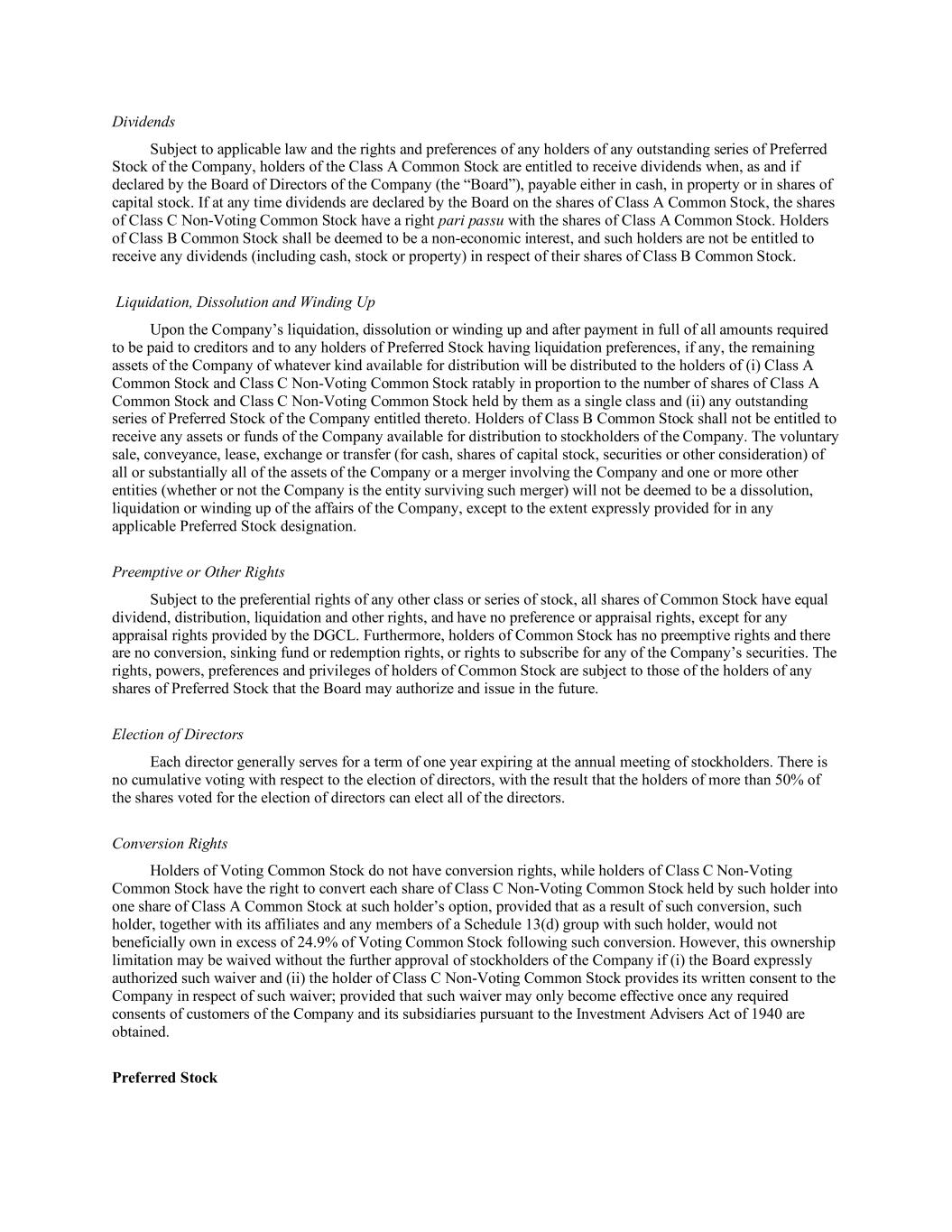 Dividends Subject to applicable law and the rights and preferences of any holders of any outstanding series of Preferred Stock of the Company, holders of the Class A Common Stock are entitled to receive dividends when, as and if declared by the Board of Directors of the Company (the “Board”), payable either in cash, in property or in shares of capital stock. If at any time dividends are declared by the Board on the shares of Class A Common Stock, the shares of Class C Non-Voting Common Stock have a right pari passu with the shares of Class A Common Stock. Holders of Class B Common Stock shall be deemed to be a non-economic interest, and such holders are not be entitled to receive any dividends (including cash, stock or property) in respect of their shares of Class B Common Stock. Liquidation, Dissolution and Winding Up Upon the Company’s liquidation, dissolution or winding up and after payment in full of all amounts required to be paid to creditors and to any holders of Preferred Stock having liquidation preferences, if any, the remaining assets of the Company of whatever kind available for distribution will be distributed to the holders of (i) Class A Common Stock and Class C Non-Voting Common Stock ratably in proportion to the number of shares of Class A Common Stock and Class C Non-Voting Common Stock held by them as a single class and (ii) any outstanding series of Preferred Stock of the Company entitled thereto. Holders of Class B Common Stock shall not be entitled to receive any assets or funds of the Company available for distribution to stockholders of the Company. The voluntary sale, conveyance, lease, exchange or transfer (for cash, shares of capital stock, securities or other consideration) of all or substantially all of the assets of the Company or a merger involving the Company and one or more other entities (whether or not the Company is the entity surviving such merger) will not be deemed to be a dissolution, liquidation or winding up of the affairs of the Company, except to the extent expressly provided for in any applicable Preferred Stock designation. Preemptive or Other Rights Subject to the preferential rights of any other class or series of stock, all shares of Common Stock have equal dividend, distribution, liquidation and other rights, and have no preference or appraisal rights, except for any appraisal rights provided by the DGCL. Furthermore, holders of Common Stock has no preemptive rights and there are no conversion, sinking fund or redemption rights, or rights to subscribe for any of the Company’s securities. The rights, powers, preferences and privileges of holders of Common Stock are subject to those of the holders of any shares of Preferred Stock that the Board may authorize and issue in the future. Election of Directors Each director generally serves for a term of one year expiring at the annual meeting of stockholders. There is no cumulative voting with respect to the election of directors, with the result that the holders of more than 50% of the shares voted for the election of directors can elect all of the directors. Conversion Rights Holders of Voting Common Stock do not have conversion rights, while holders of Class C Non-Voting Common Stock have the right to convert each share of Class C Non-Voting Common Stock held by such holder into one share of Class A Common Stock at such holder’s option, provided that as a result of such conversion, such holder, together with its affiliates and any members of a Schedule 13(d) group with such holder, would not beneficially own in excess of 24.9% of Voting Common Stock following such conversion. However, this ownership limitation may be waived without the further approval of stockholders of the Company if (i) the Board expressly authorized such waiver and (ii) the holder of Class C Non-Voting Common Stock provides its written consent to the Company in respect of such waiver; provided that such waiver may only become effective once any required consents of customers of the Company and its subsidiaries pursuant to the Investment Advisers Act of 1940 are obtained. Preferred Stock