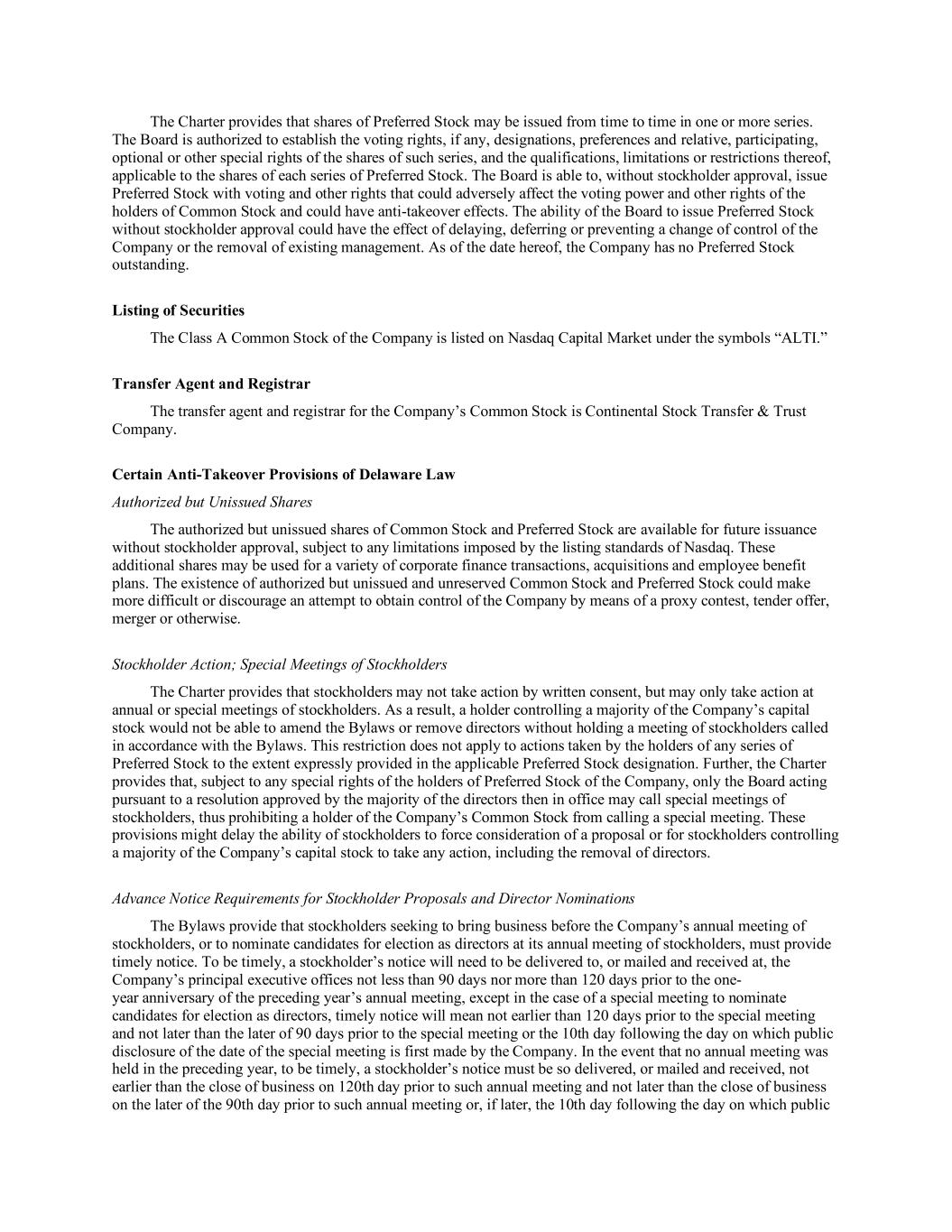 The Charter provides that shares of Preferred Stock may be issued from time to time in one or more series. The Board is authorized to establish the voting rights, if any, designations, preferences and relative, participating, optional or other special rights of the shares of such series, and the qualifications, limitations or restrictions thereof, applicable to the shares of each series of Preferred Stock. The Board is able to, without stockholder approval, issue Preferred Stock with voting and other rights that could adversely affect the voting power and other rights of the holders of Common Stock and could have anti-takeover effects. The ability of the Board to issue Preferred Stock without stockholder approval could have the effect of delaying, deferring or preventing a change of control of the Company or the removal of existing management. As of the date hereof, the Company has no Preferred Stock outstanding. Listing of Securities The Class A Common Stock of the Company is listed on Nasdaq Capital Market under the symbols “ALTI.” Transfer Agent and Registrar The transfer agent and registrar for the Company’s Common Stock is Continental Stock Transfer & Trust Company. Certain Anti-Takeover Provisions of Delaware Law Authorized but Unissued Shares The authorized but unissued shares of Common Stock and Preferred Stock are available for future issuance without stockholder approval, subject to any limitations imposed by the listing standards of Nasdaq. These additional shares may be used for a variety of corporate finance transactions, acquisitions and employee benefit plans. The existence of authorized but unissued and unreserved Common Stock and Preferred Stock could make more difficult or discourage an attempt to obtain control of the Company by means of a proxy contest, tender offer, merger or otherwise. Stockholder Action; Special Meetings of Stockholders The Charter provides that stockholders may not take action by written consent, but may only take action at annual or special meetings of stockholders. As a result, a holder controlling a majority of the Company’s capital stock would not be able to amend the Bylaws or remove directors without holding a meeting of stockholders called in accordance with the Bylaws. This restriction does not apply to actions taken by the holders of any series of Preferred Stock to the extent expressly provided in the applicable Preferred Stock designation. Further, the Charter provides that, subject to any special rights of the holders of Preferred Stock of the Company, only the Board acting pursuant to a resolution approved by the majority of the directors then in office may call special meetings of stockholders, thus prohibiting a holder of the Company’s Common Stock from calling a special meeting. These provisions might delay the ability of stockholders to force consideration of a proposal or for stockholders controlling a majority of the Company’s capital stock to take any action, including the removal of directors. Advance Notice Requirements for Stockholder Proposals and Director Nominations The Bylaws provide that stockholders seeking to bring business before the Company’s annual meeting of stockholders, or to nominate candidates for election as directors at its annual meeting of stockholders, must provide timely notice. To be timely, a stockholder’s notice will need to be delivered to, or mailed and received at, the Company’s principal executive offices not less than 90 days nor more than 120 days prior to the one- year anniversary of the preceding year’s annual meeting, except in the case of a special meeting to nominate candidates for election as directors, timely notice will mean not earlier than 120 days prior to the special meeting and not later than the later of 90 days prior to the special meeting or the 10th day following the day on which public disclosure of the date of the special meeting is first made by the Company. In the event that no annual meeting was held in the preceding year, to be timely, a stockholder’s notice must be so delivered, or mailed and received, not earlier than the close of business on 120th day prior to such annual meeting and not later than the close of business on the later of the 90th day prior to such annual meeting or, if later, the 10th day following the day on which public